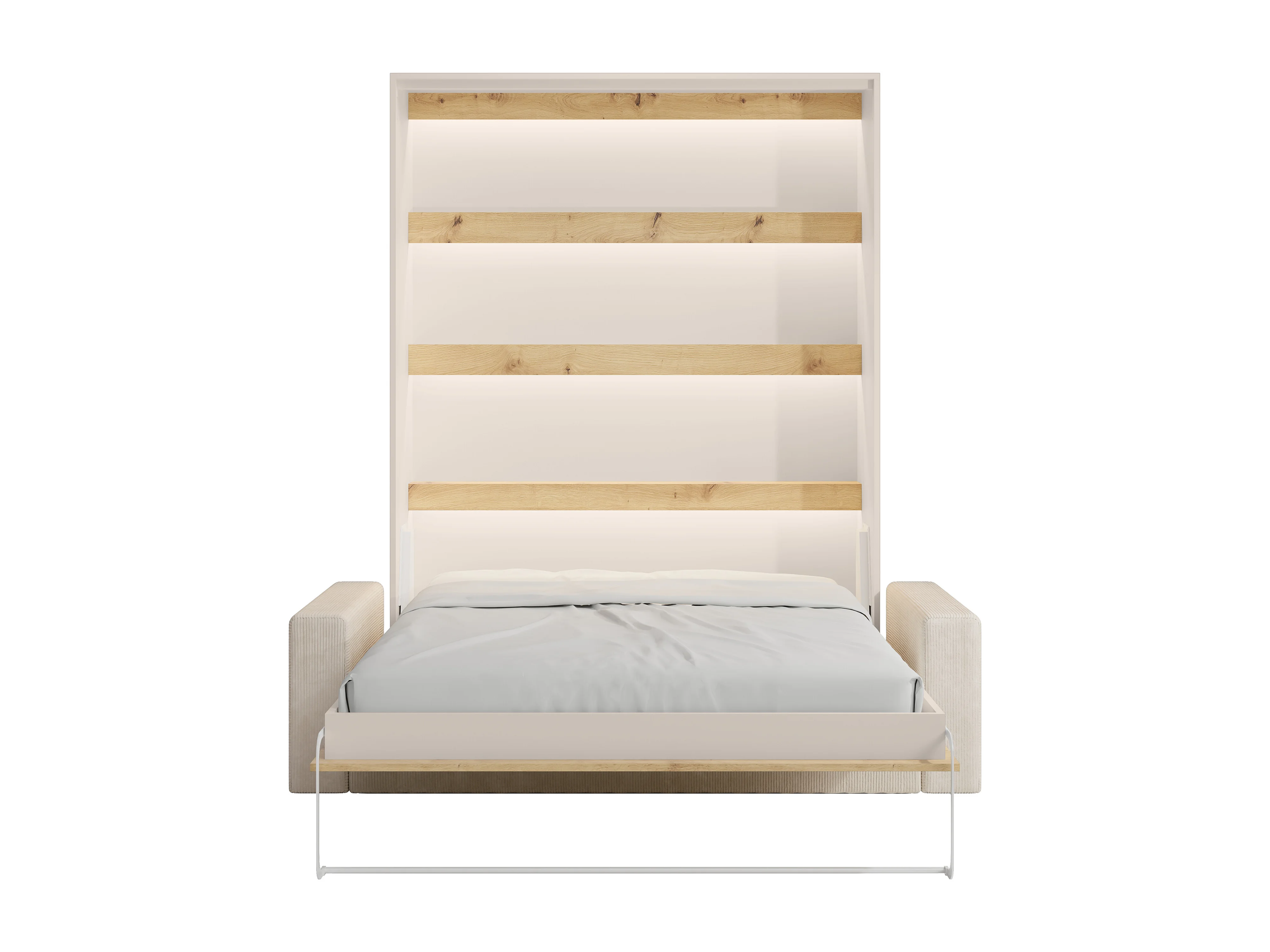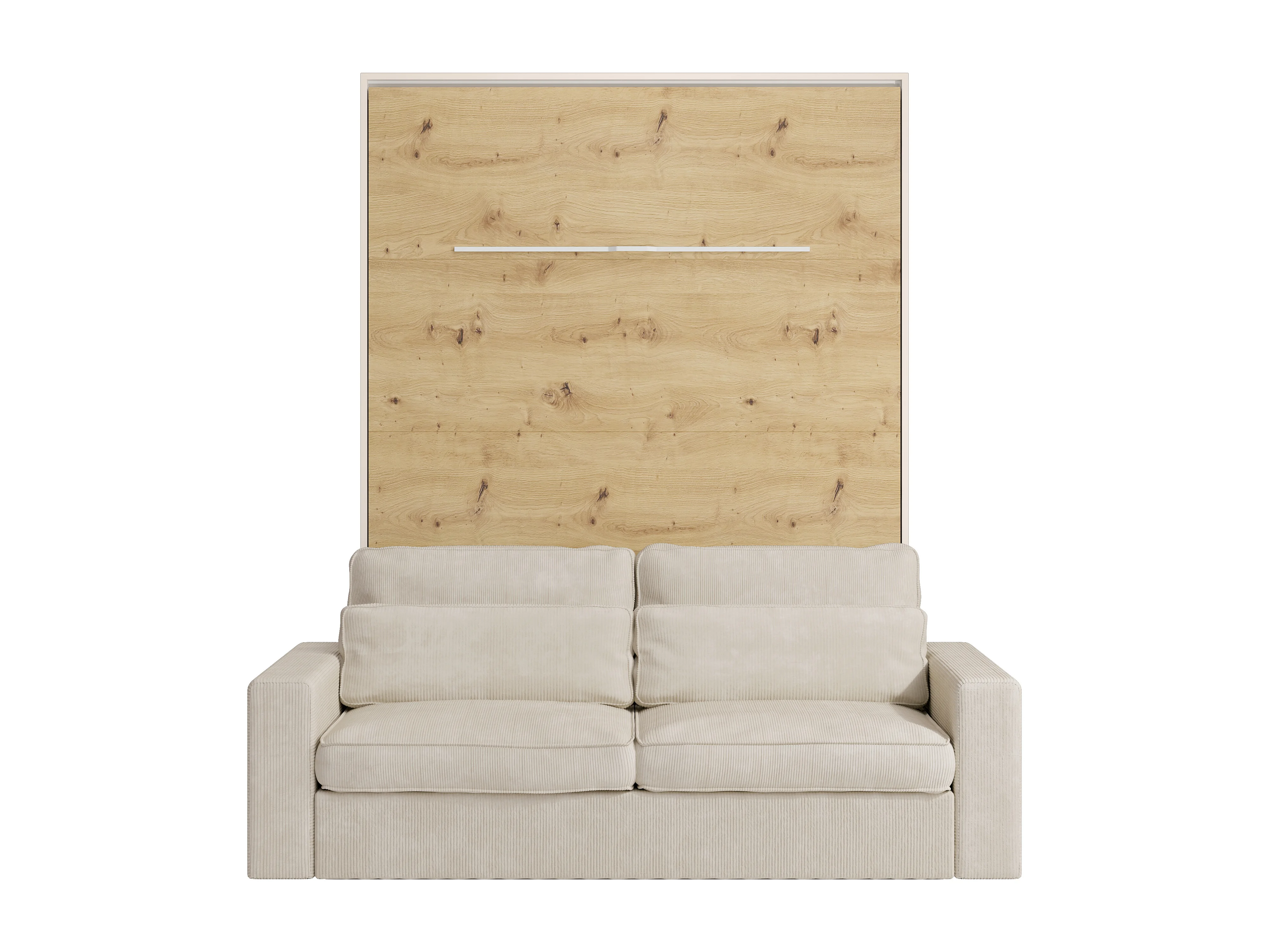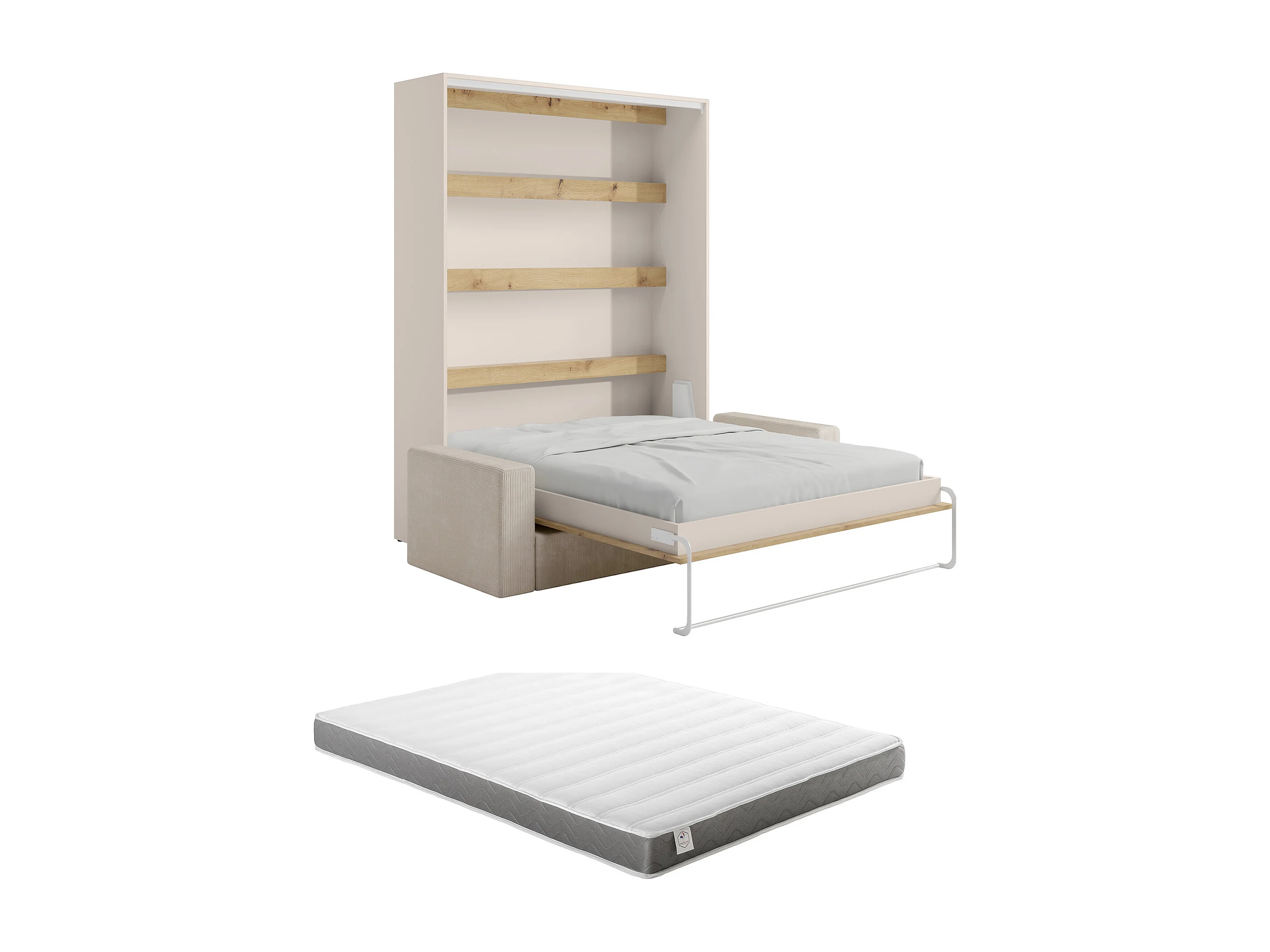 Lit escamotable 160 x 200 cm - Ouverture verticale manuelle - Avec LEDs - Beige et naturel + Canapé + Matelas - RAPILI