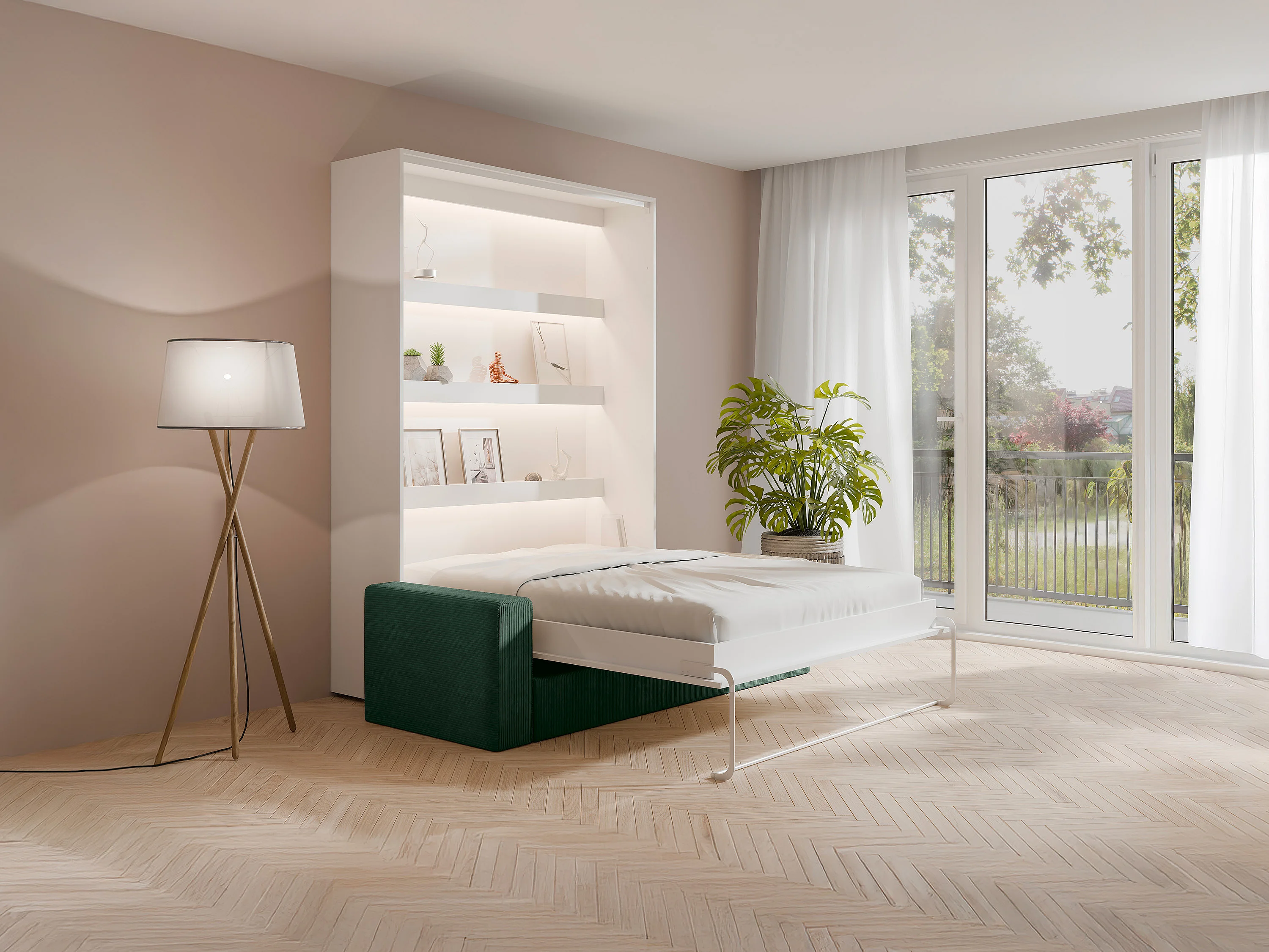 Lit escamotable 160 x 200 cm - Ouverture verticale manuelle - Avec LEDs - Blanc + Canapé Vert - RAPILI