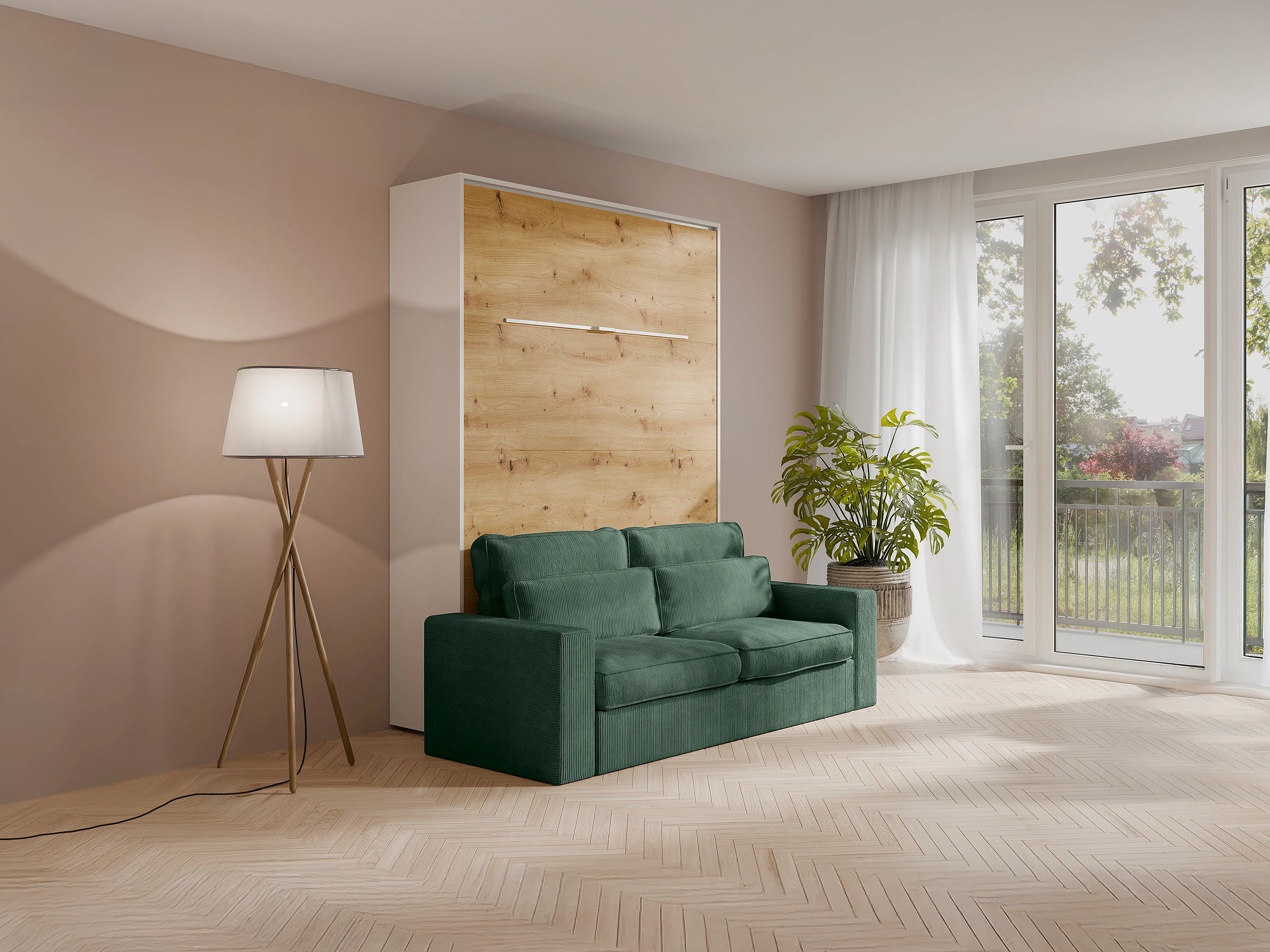 Lit escamotable 160 x 200 cm - Ouverture verticale manuelle - Avec LEDs - Blanc et naturel + Canapé Vert - RAPILI
