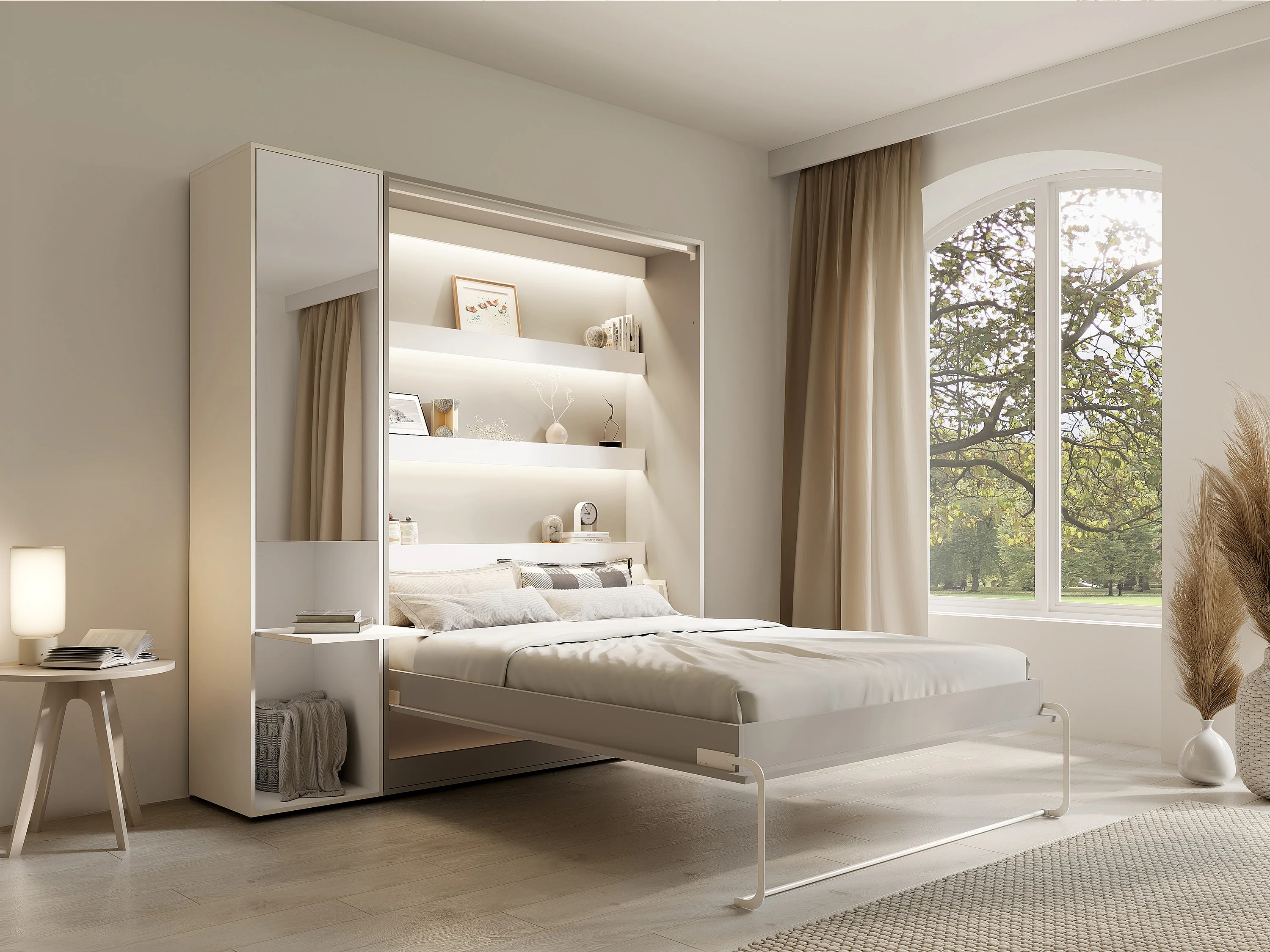 Lit escamotable vertical 140 x 200 cm - 1 colonne de rangement - Avec miroir et LEDs - Beige - RAPILI