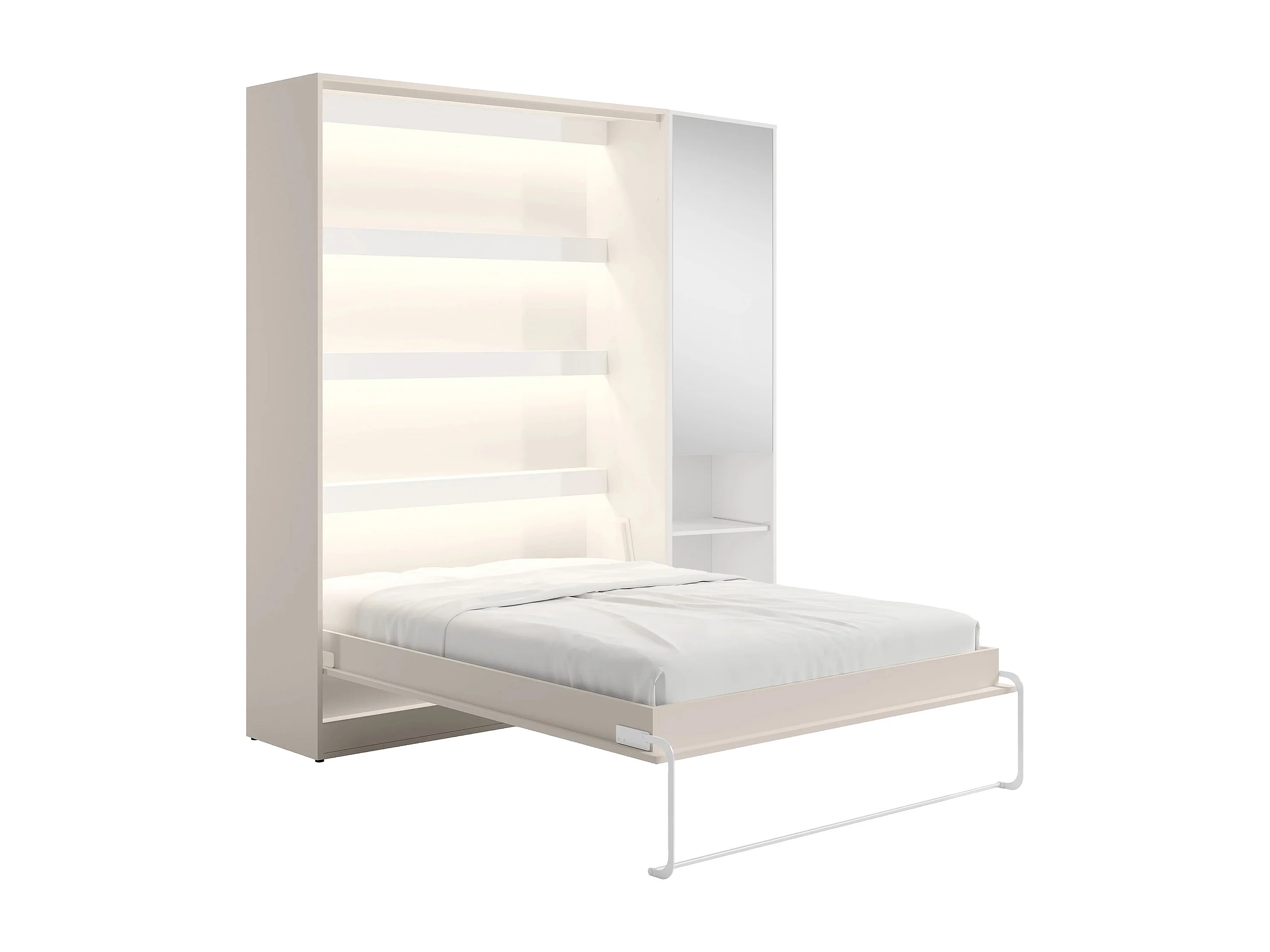 Lit escamotable vertical 160 x 200 cm - 1 colonne de rangement - Avec miroir et LEDs - Beige + Matelas - RAPILI