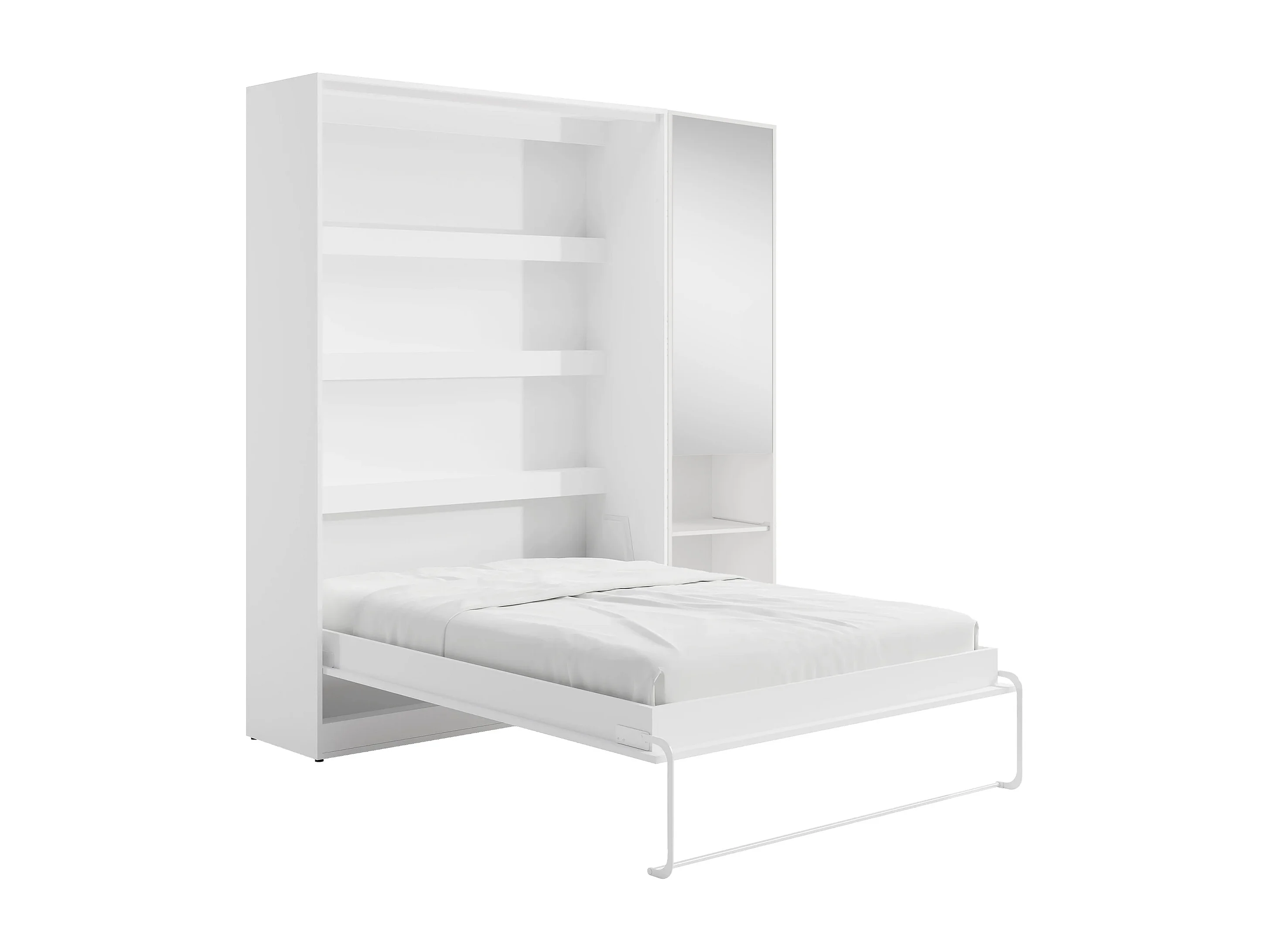 Lit escamotable vertical 160 x 200 cm - 1 colonne de rangement - Avec miroir et LEDs - Blanc + Matelas - RAPILI