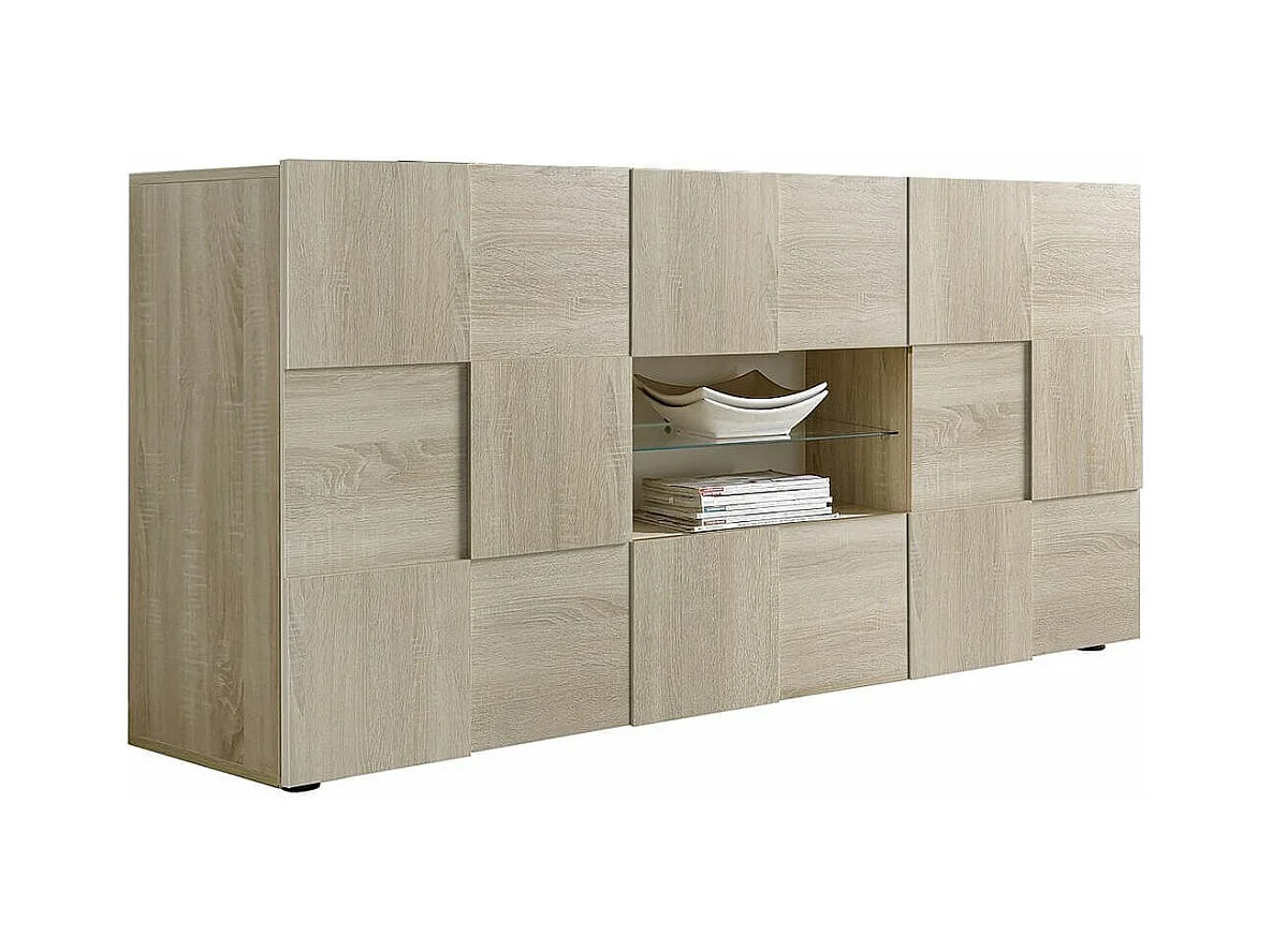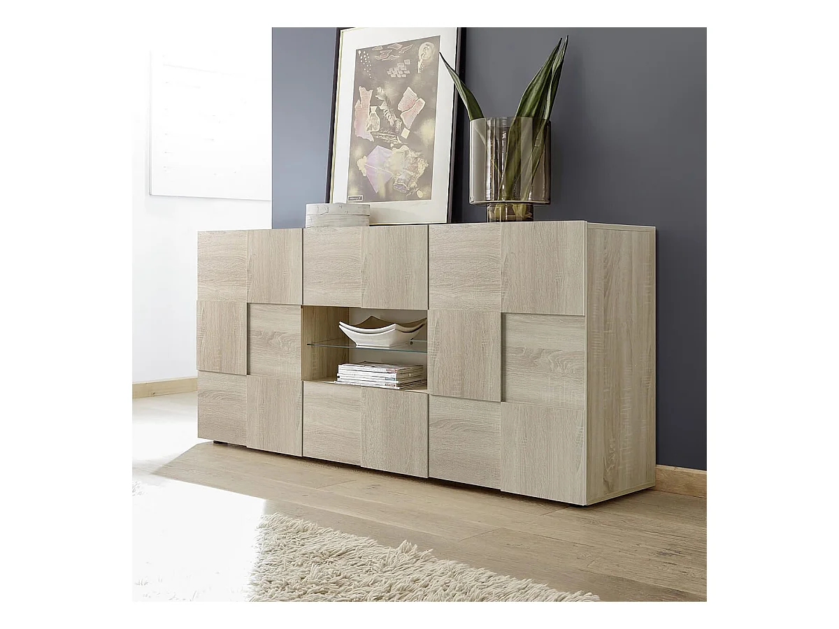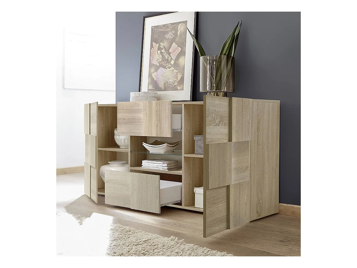 REBECCA - Buffet 2 Portes 2 Tiroirs Finition Aspect Bois Samoa Relief Damiers