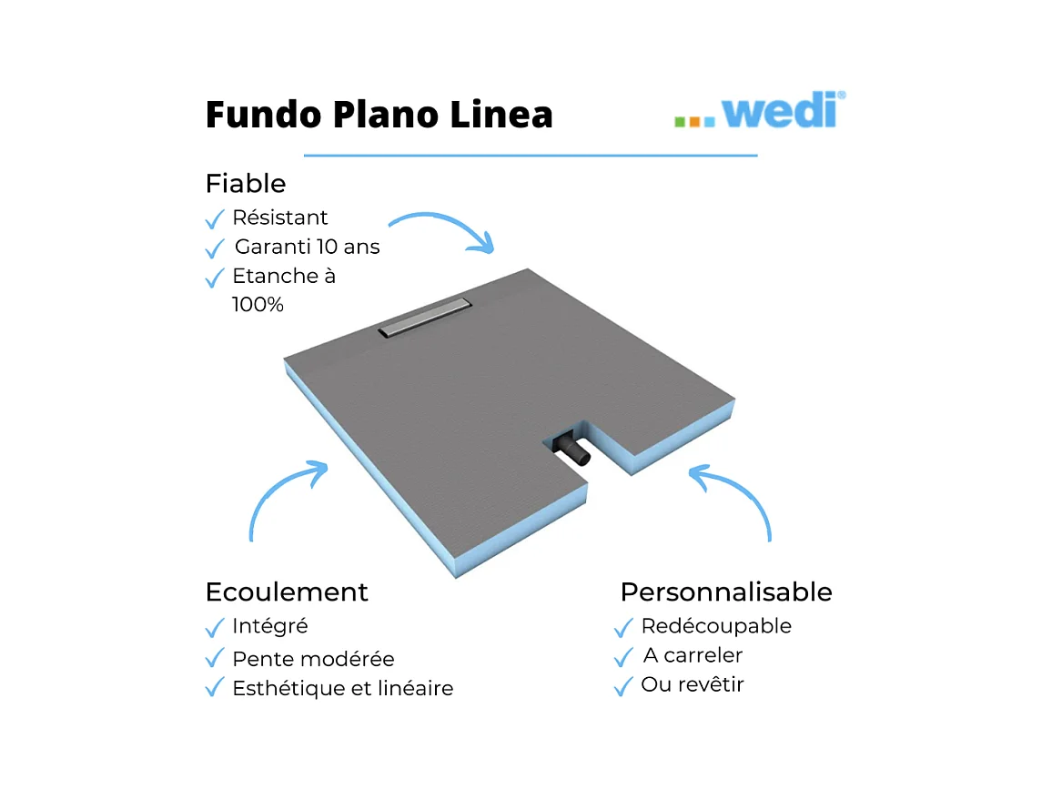 Receveur à carreler 90 x 90 cm Wedi Fundo Plano Linea - écoulement linéaire sortie sur le petit coté + kit d'étanchéité + Wedi 320