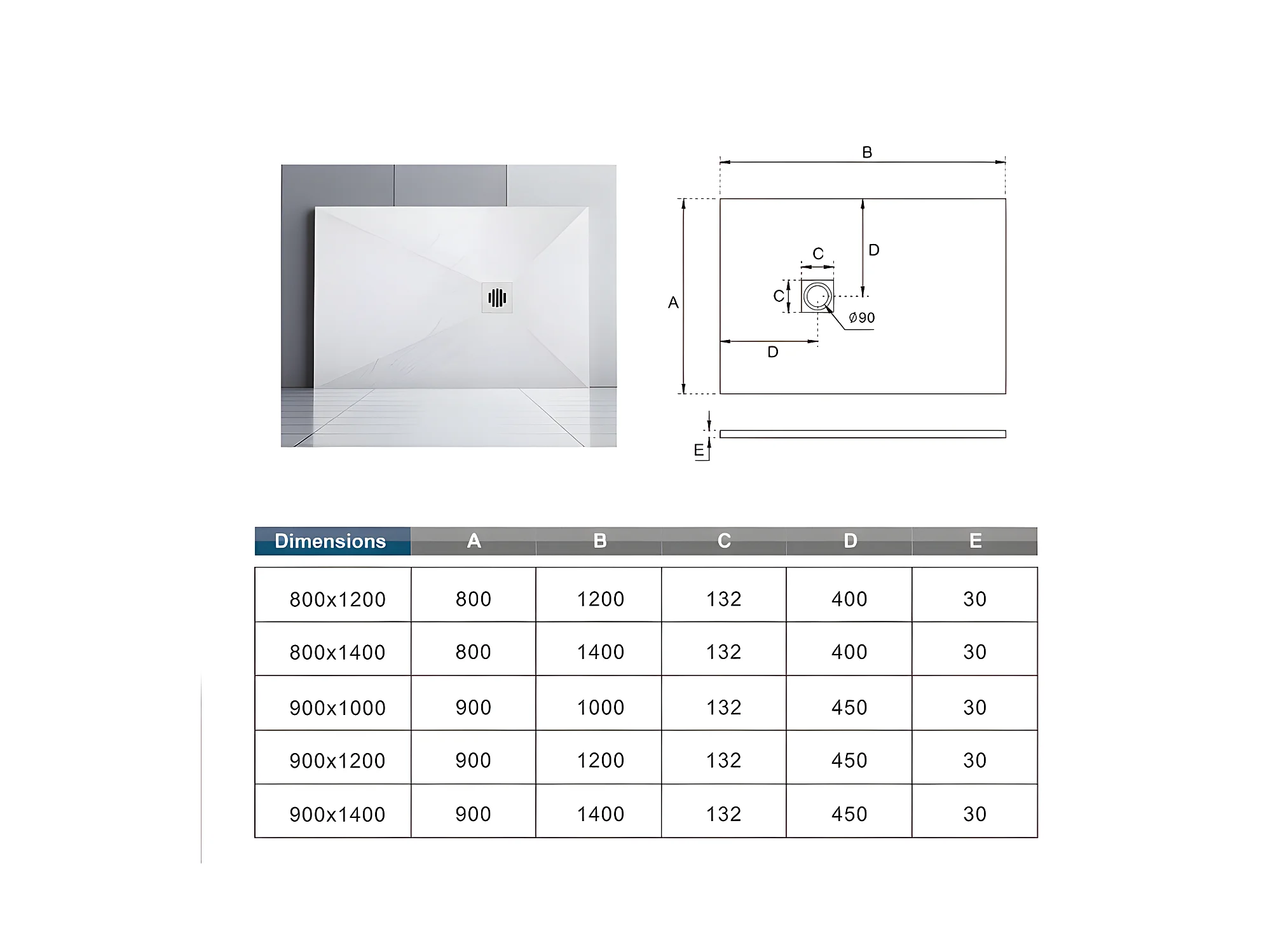 Receveur de douche 140x80cm avec une grille en ABS, bac à douche rectangulaire, Extra-plat, blanc, anti-dérapant