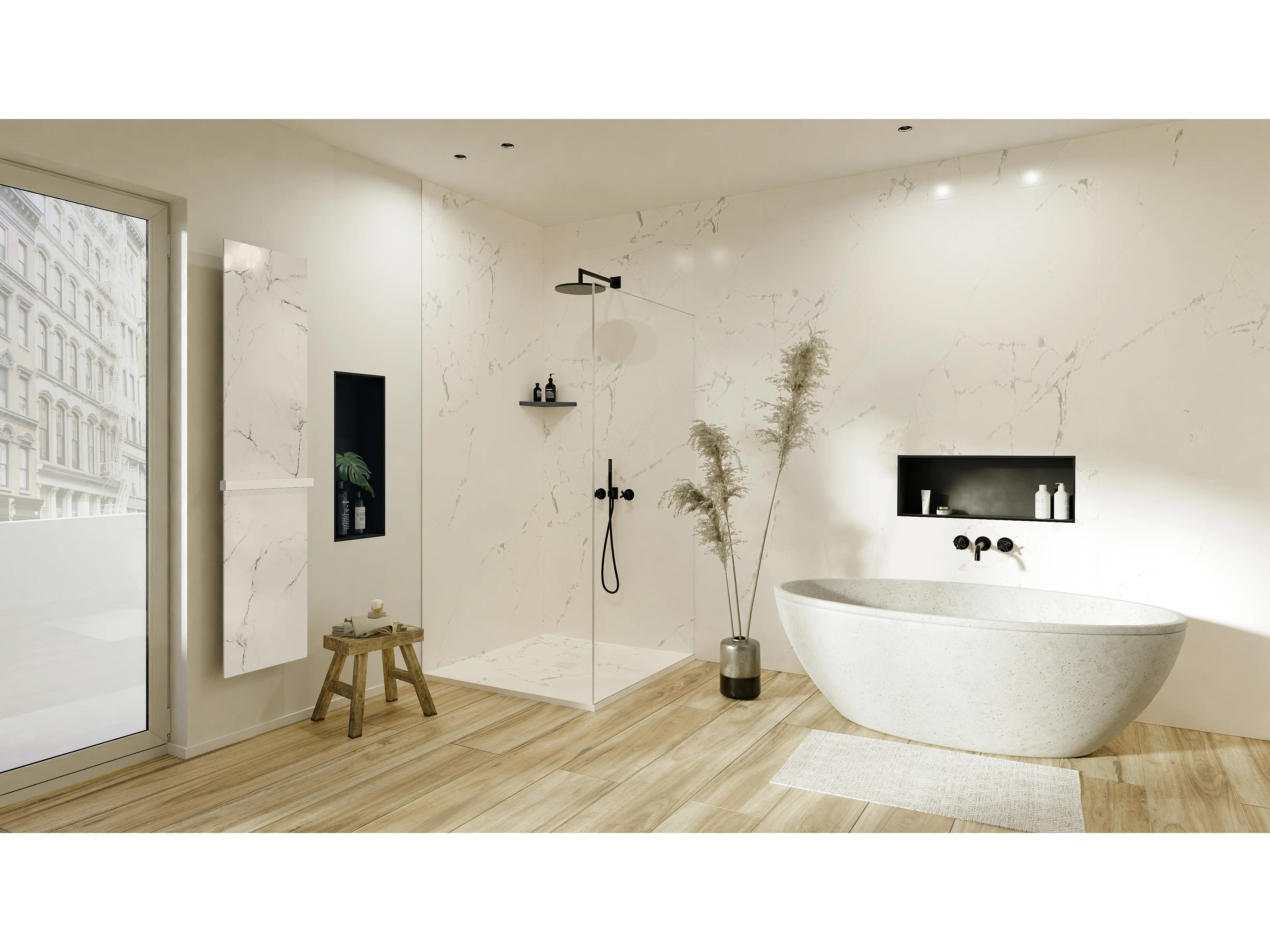 Receveur de douche 70x70 cm en résine effet marbre blanc – caniveau linéaire excentré/centré inox blanc, siphon ultra-plat + natte étanche