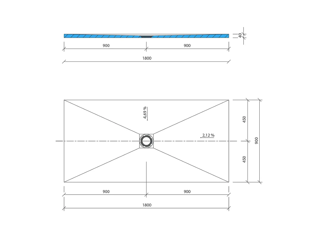 Receveur de douche à carreler 180 x 90 WEDI Fundo Primo rectangle écoulement centré + bonde verticale + kit d'étanchéité