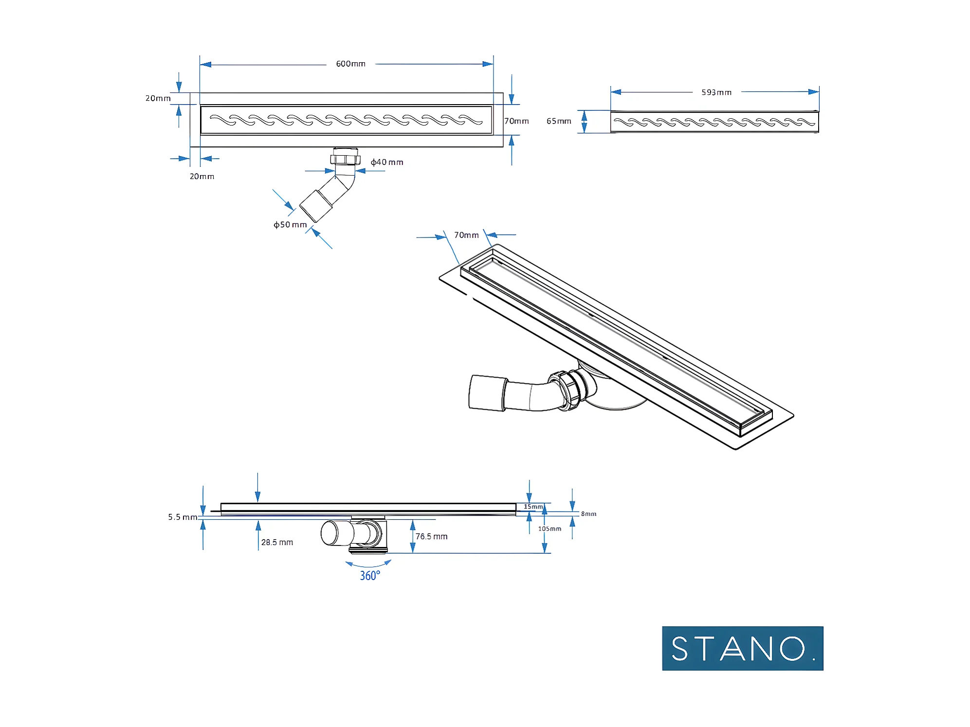 Receveur de douche à carreler 90 x 140 cm ELIO 4 pentes grille linéaire et bonde incluses