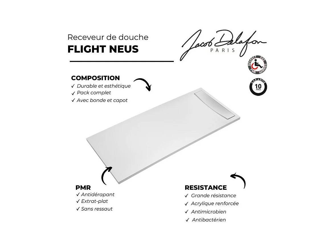Receveur de douche antidérapant 180 x 80 JACOB DELAFON Flight Neus rectangle blanc + bonde + capot