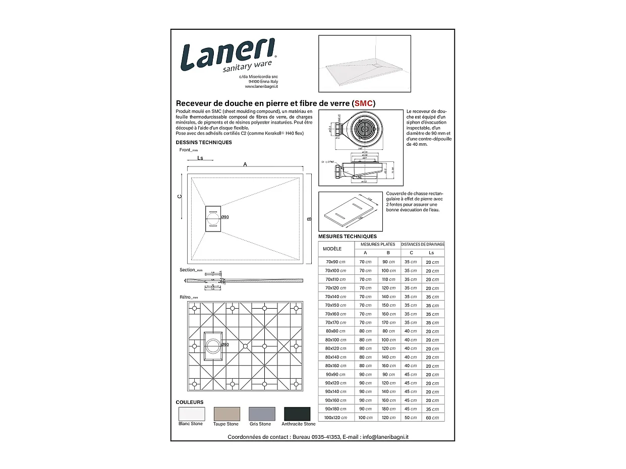 Receveur de douche SMC en fibre de verre effet pierre avec bonde inclus H. 2,6 cm 70 x 170 Gris