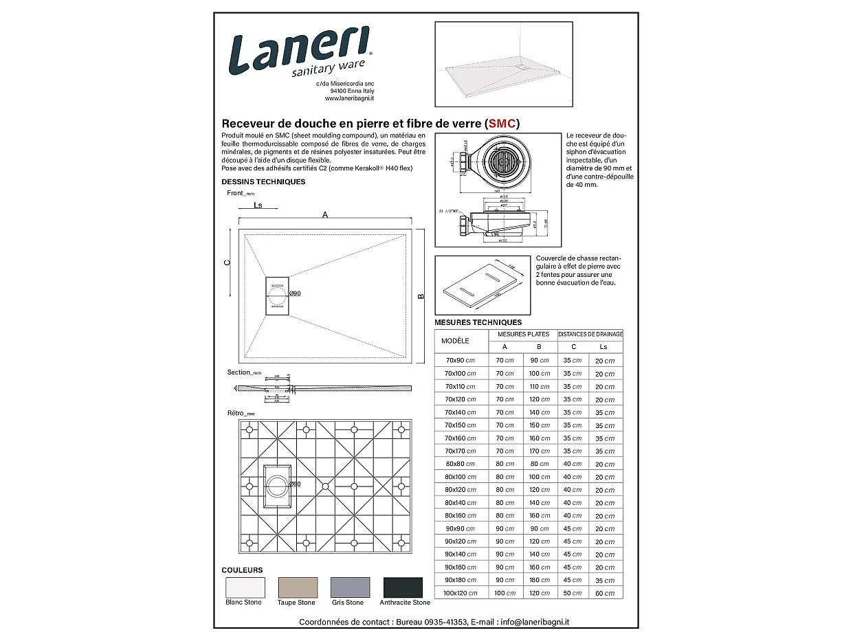 Receveur de douche SMC en fibre de verre effet pierre avec bonde inclus H. 2,6 cm 90 x 140 Taupe