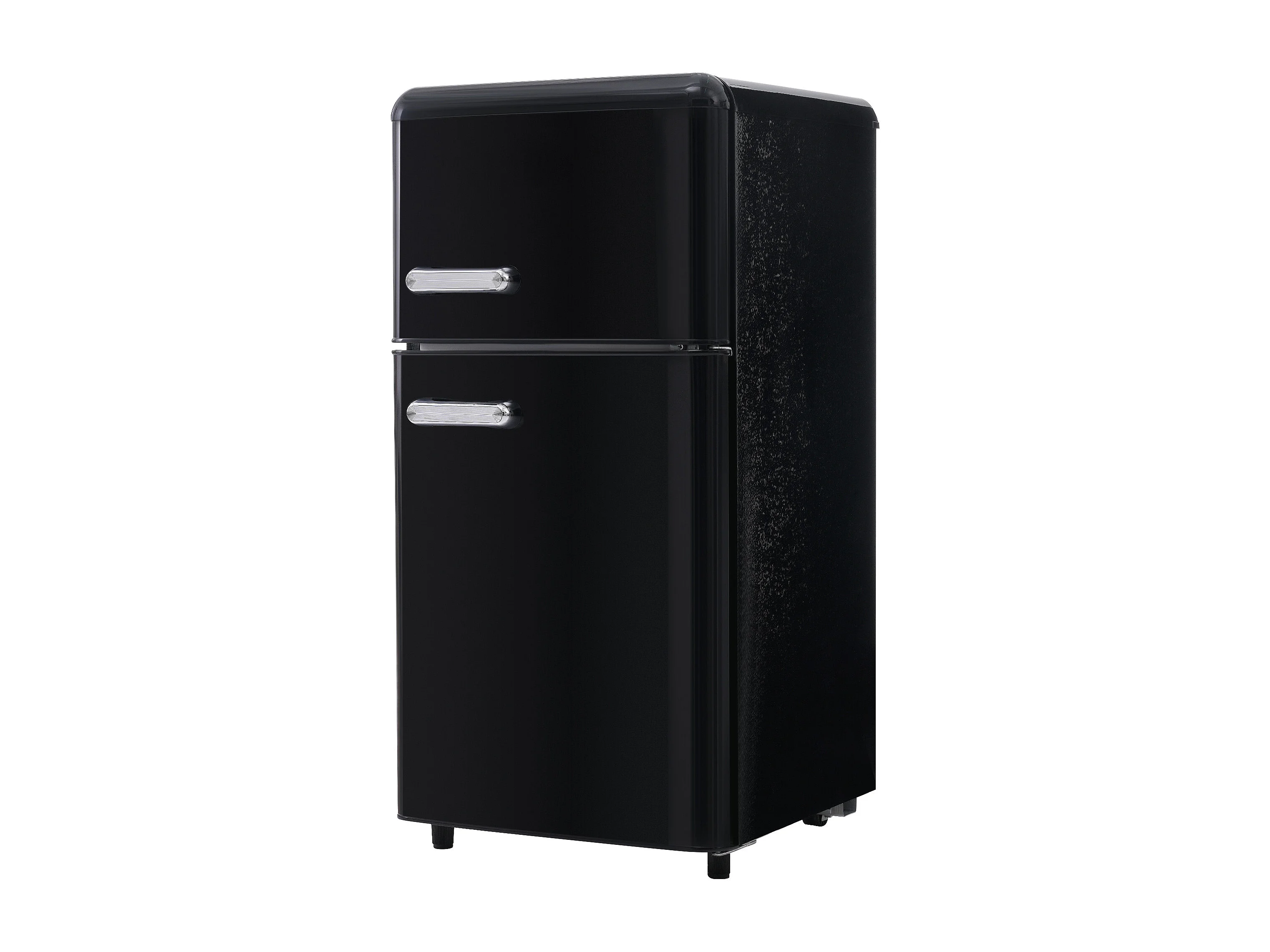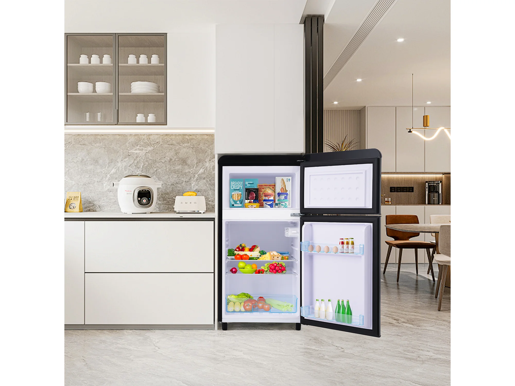 Réfrigérateur rétro 46x45x91 cm, double porte, congélateur 21 L, étagères réglables, éclairage LED, fer et plastique noir