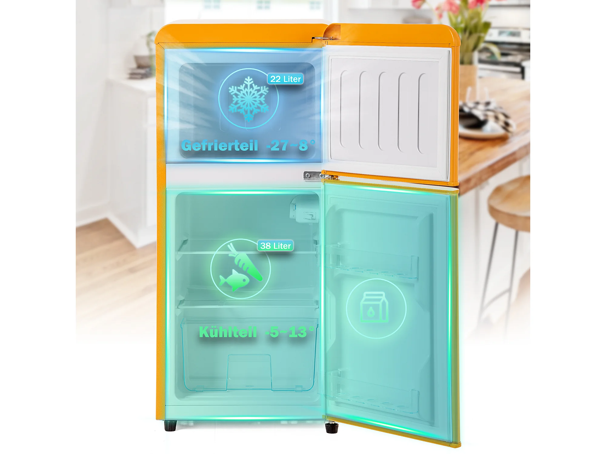 Réfrigérateur de 60 L avec 2 portes et LED - Consommation 102 kWh/an - Jaune antique