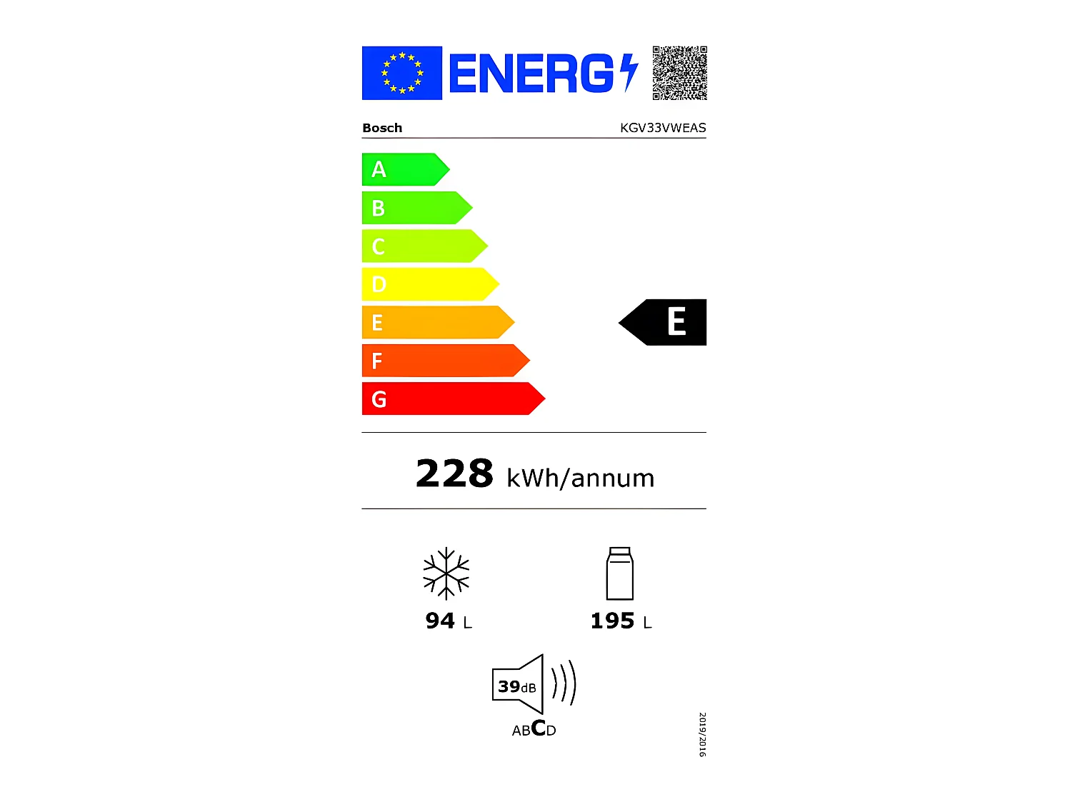Réfrigérateurs combinés 287L Froid Brassé BOSCH 60cm E, KGV33VWEAS