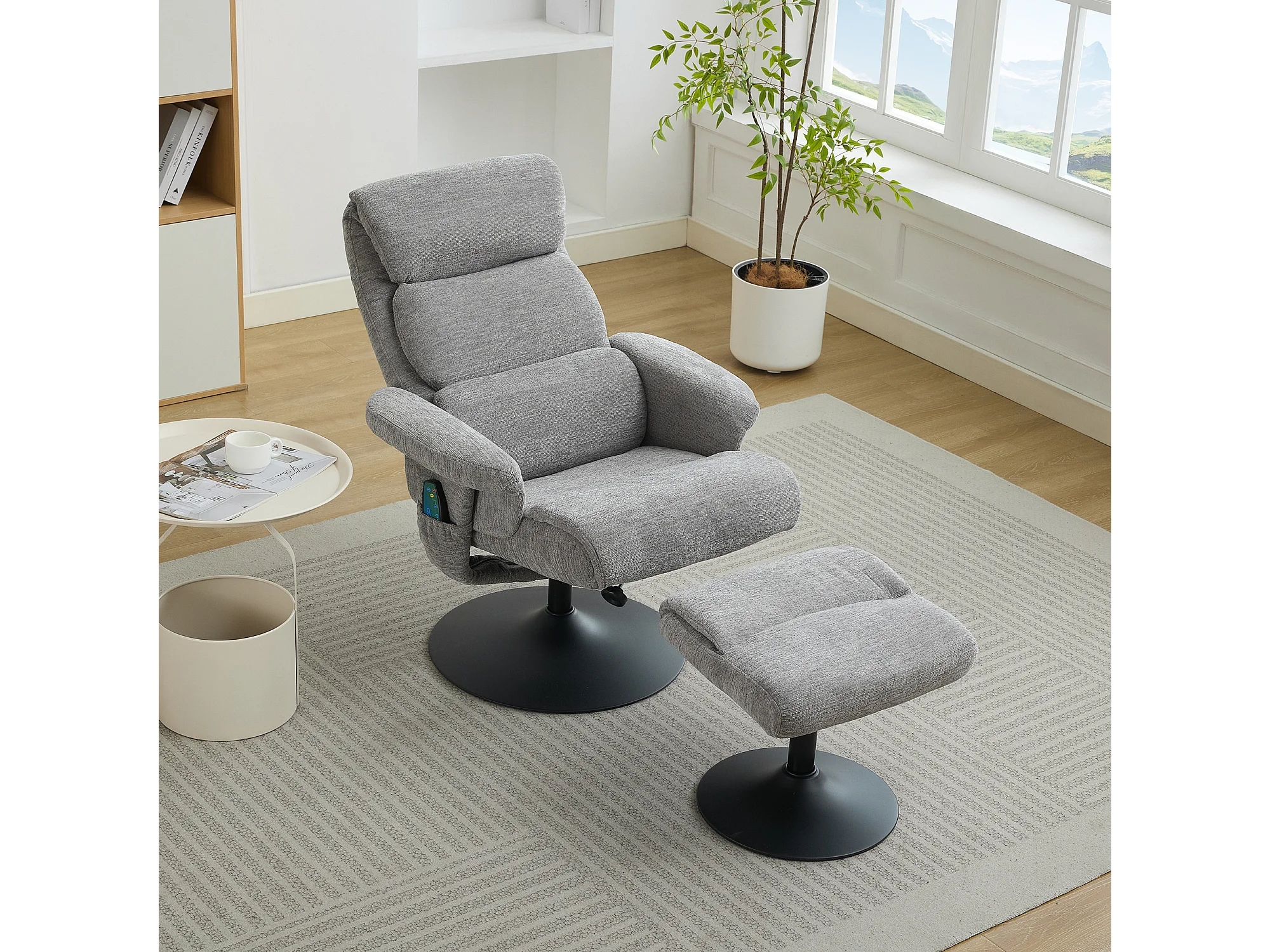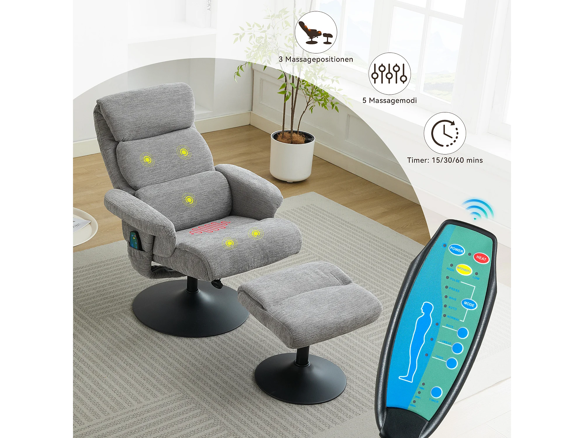 Relaxsessel avec fonction inclinable, massage à 5 points, chauffage électrique, 360° pivotant, tissu chenille gris (77x75.5x100 cm)