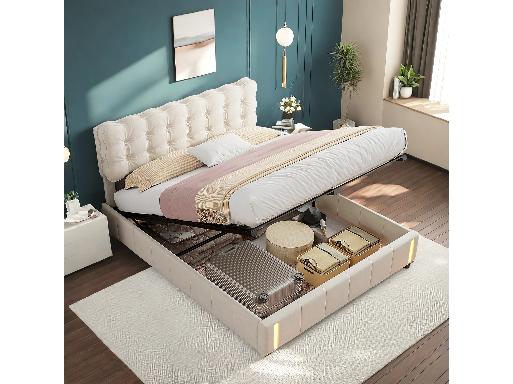 Rembourré Lit, Lit Double, 160x200cm, Cadre de Lit, Lit Coffre ,Lit Double avec Rangement sous Lit, Rangement, Velours, Beige (sans Matelas)