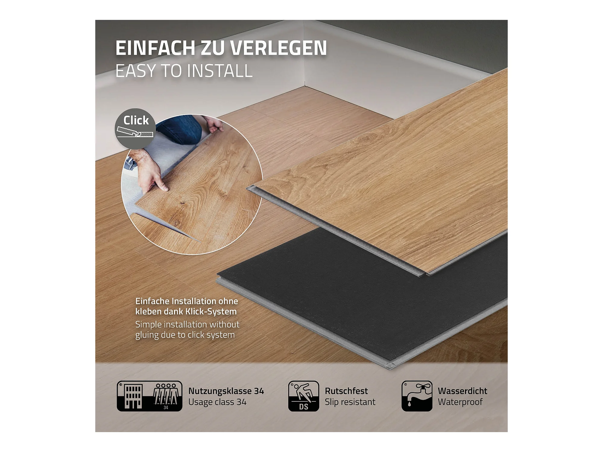 Revêtement de sol clipsable en vinyle 122cm x 18cm x 4,2mm 6,16m²/28 planches marron clair chêne sable imitation parquet pvc étanche classe charge 34