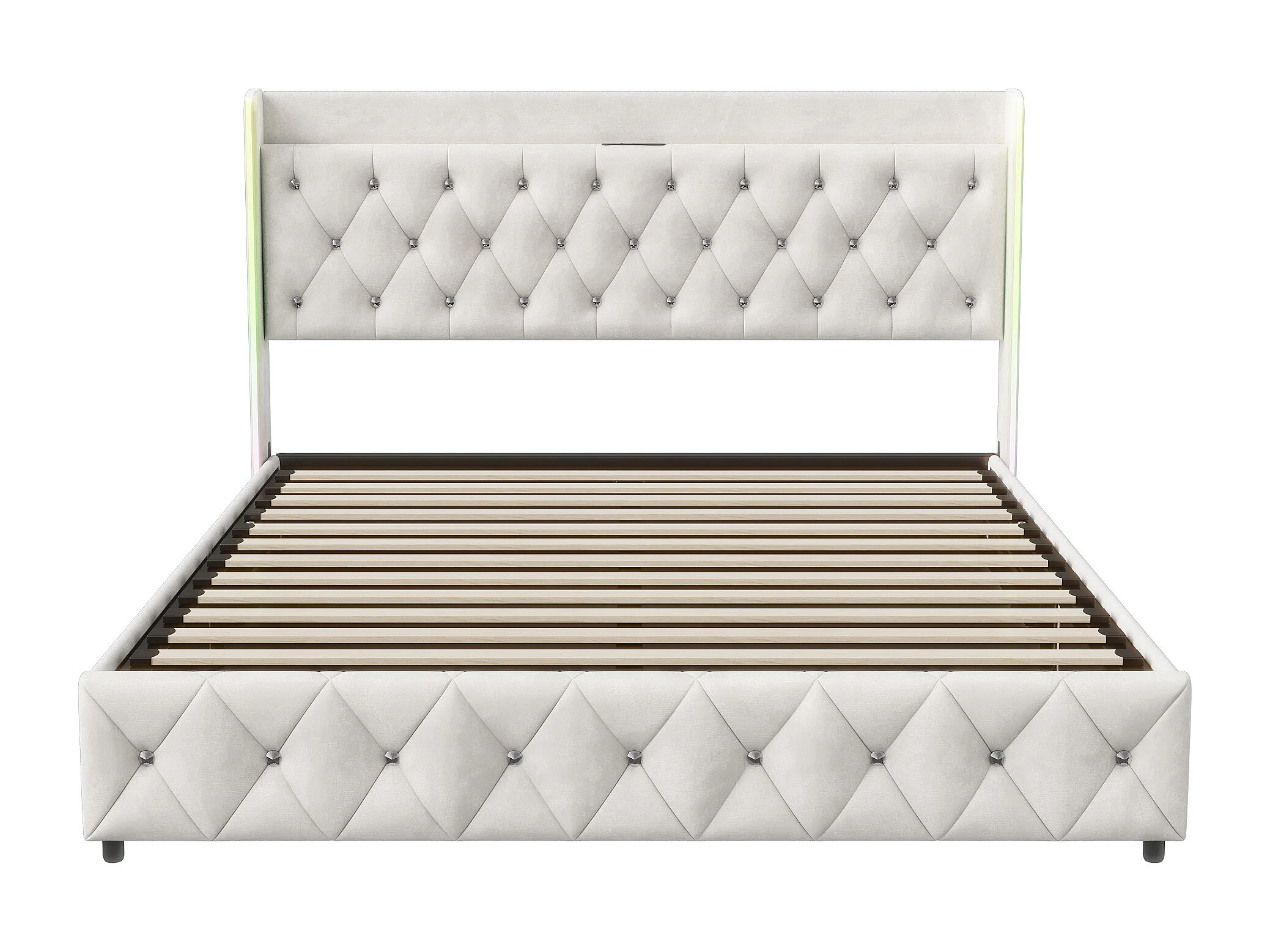 Rivet Rhombus Decor Hydraulic Storage Bed 140x200cm - Lit double avec tête à LED - Fonction de charge USB et cadre à lamelles - Velvet - Beige