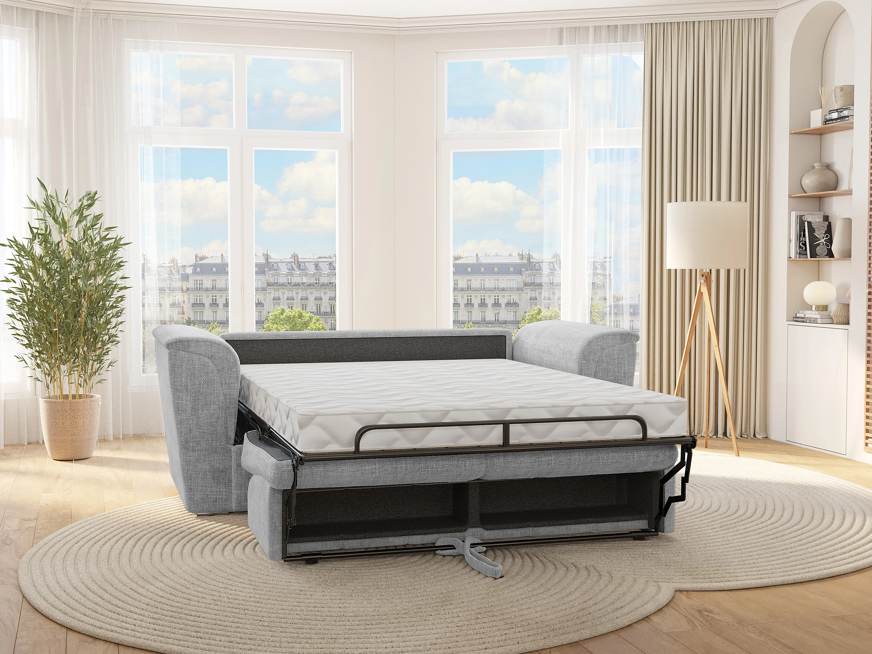 Canapé 4 places convertible express en tissu texturé gris clair - Couchage à lattes larges 160 cm - Matelas 14 cm - RIZORA