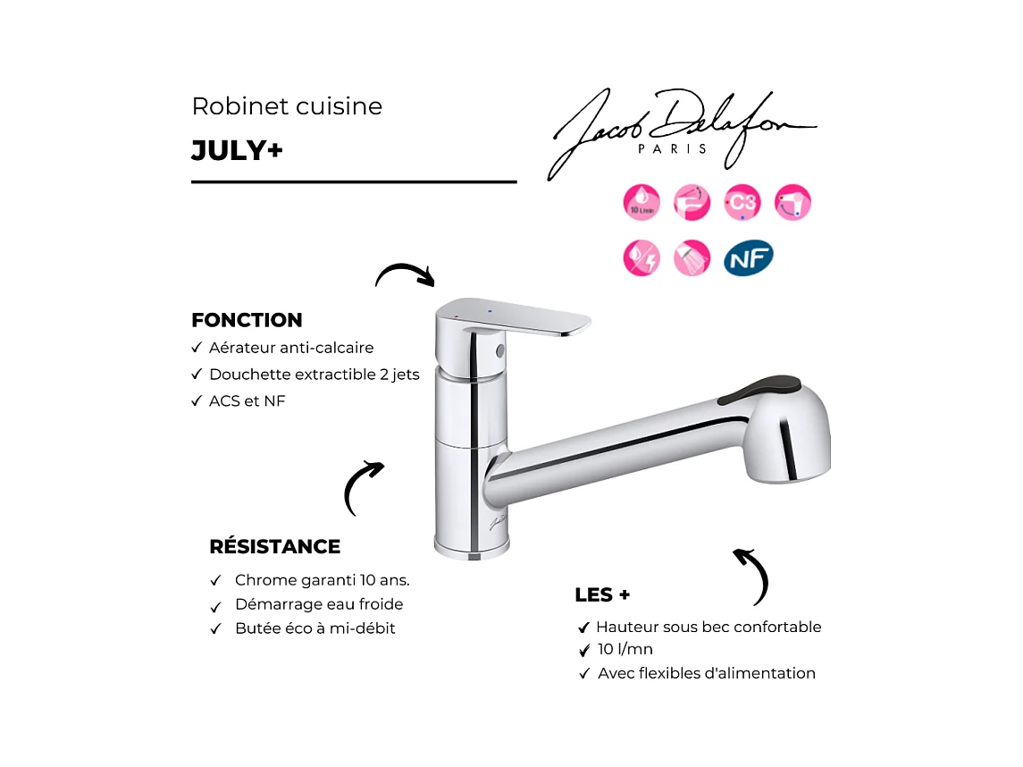 Robinet cuisine avec douchette extractible JACOB DELAFON July+ chromé