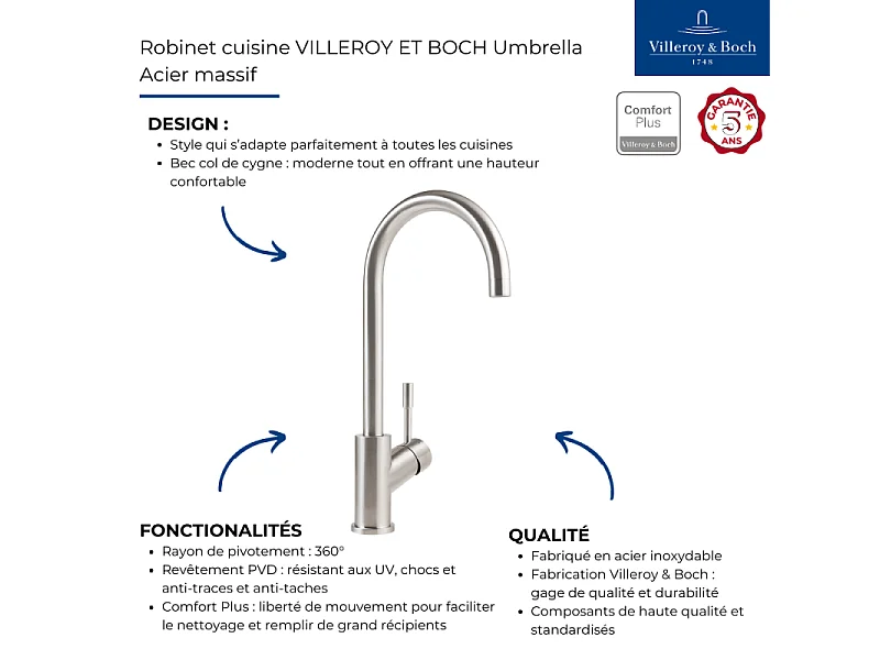 Robinet cuisine VILLEROY ET BOCH Umbrella acier massif