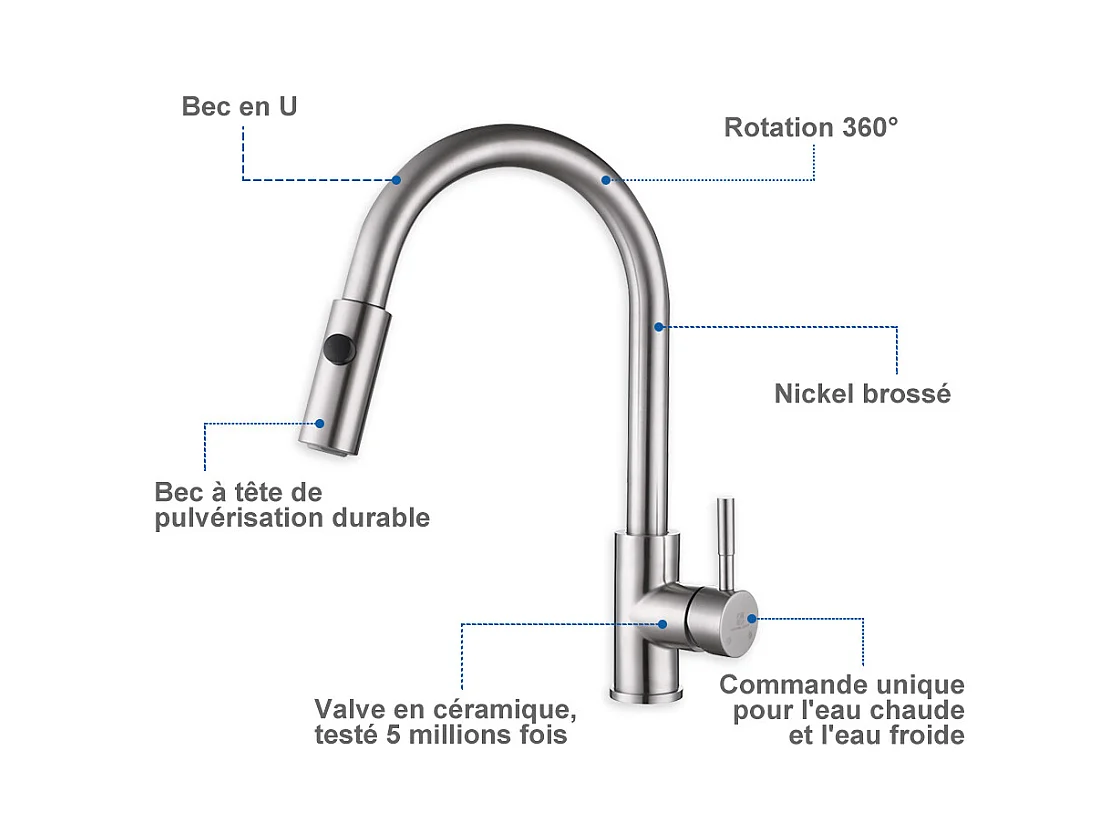 Robinet de Cuisine avec Douchette Extractible Mitigeur d'évier Bec Rotatif 360° Robinet en Acier Nickel Brossé Mitigeur de Cuisine- HOMELODY