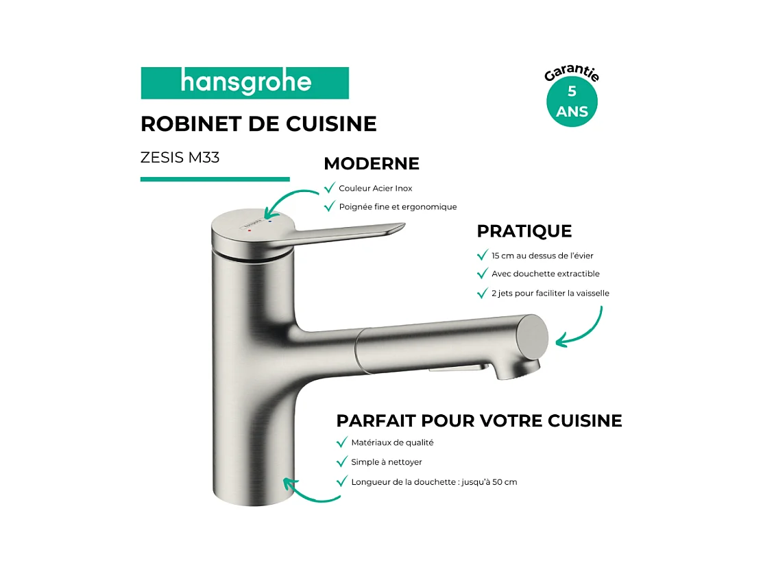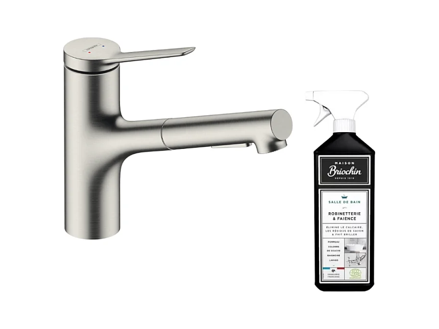 Robinet de cuisine avec douchette HANSGROHE Zesis M33 150 2 jets aspect acier inox + nettoyant Briochin