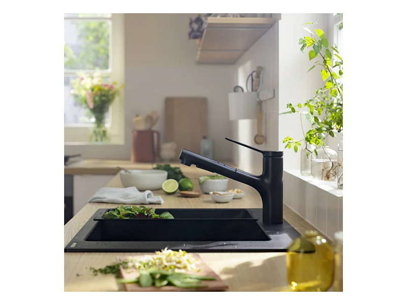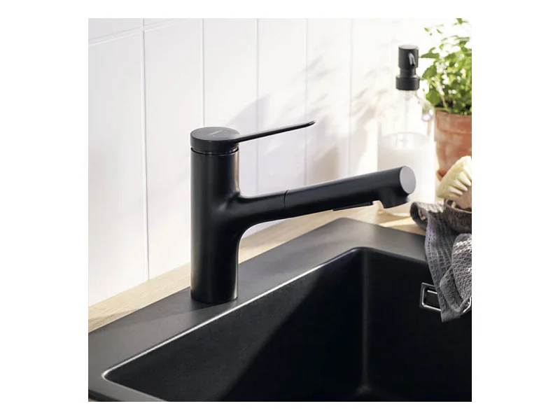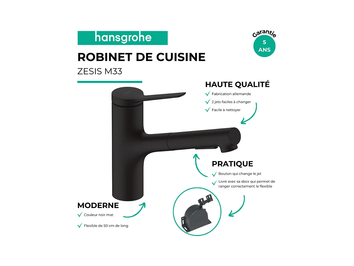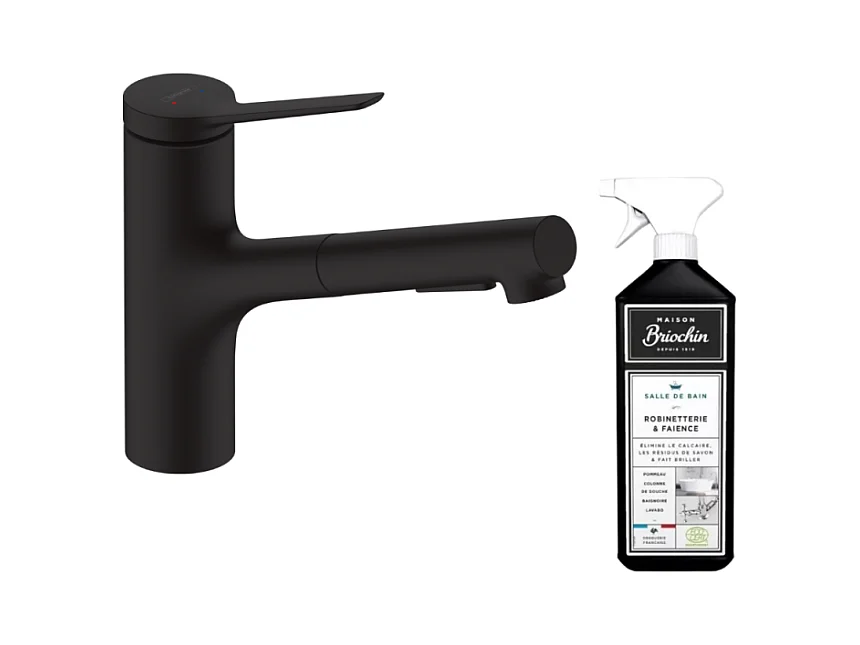 Robinet de cuisine avec douchette HANSGROHE Zesis M33 150 sBox 2 jets noir mat + nettoyant Briochin