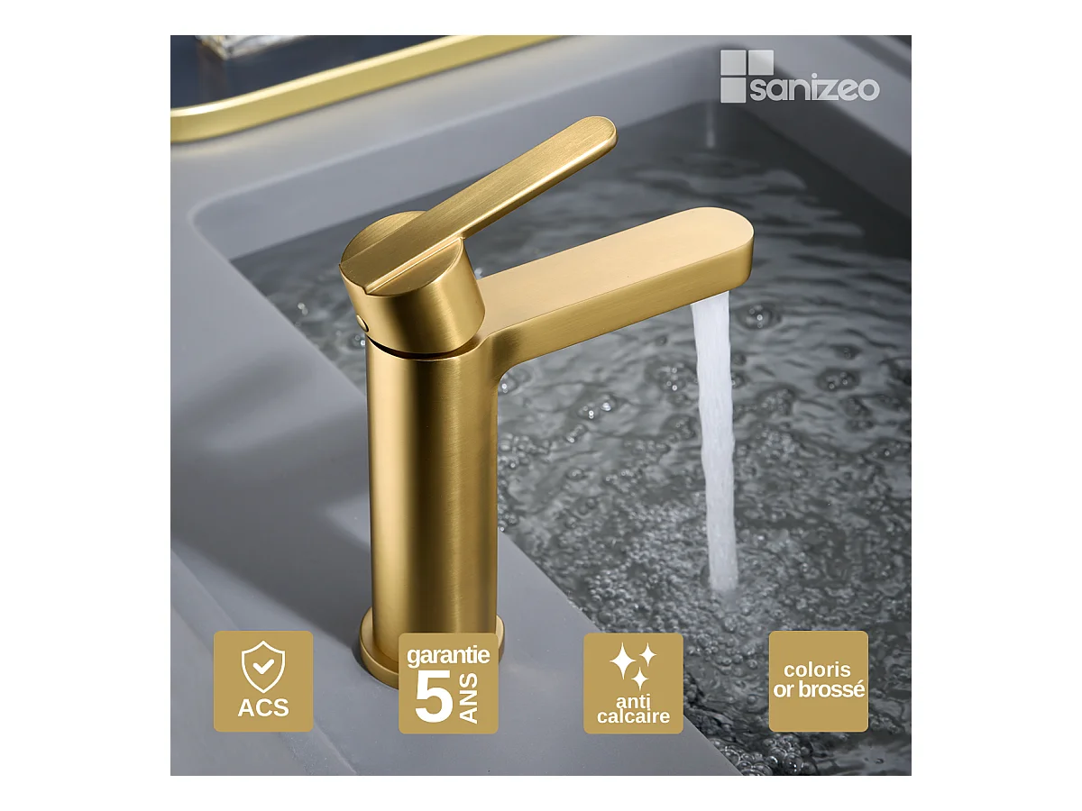 Mitigeur Lavabo Salle de Bain or brossé – Bec Haut Anti-Calcaire – Design moderne - PISA IMEX