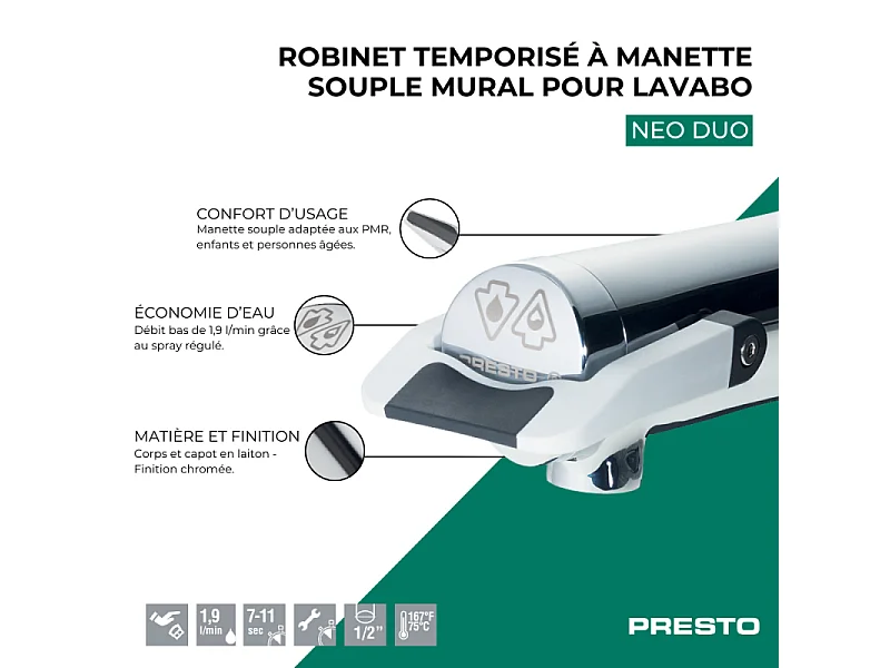 Robinet temporisé à manette souple mural pour lavabo PRESTO Neo duo chrome
