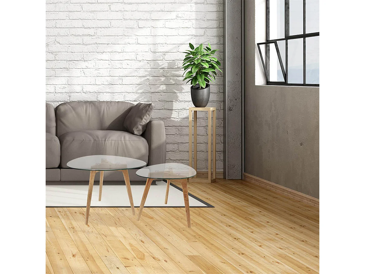 Lot de 2 Tables basses gigogne forme galet en verre trempé pieds en hévéa - INAYA