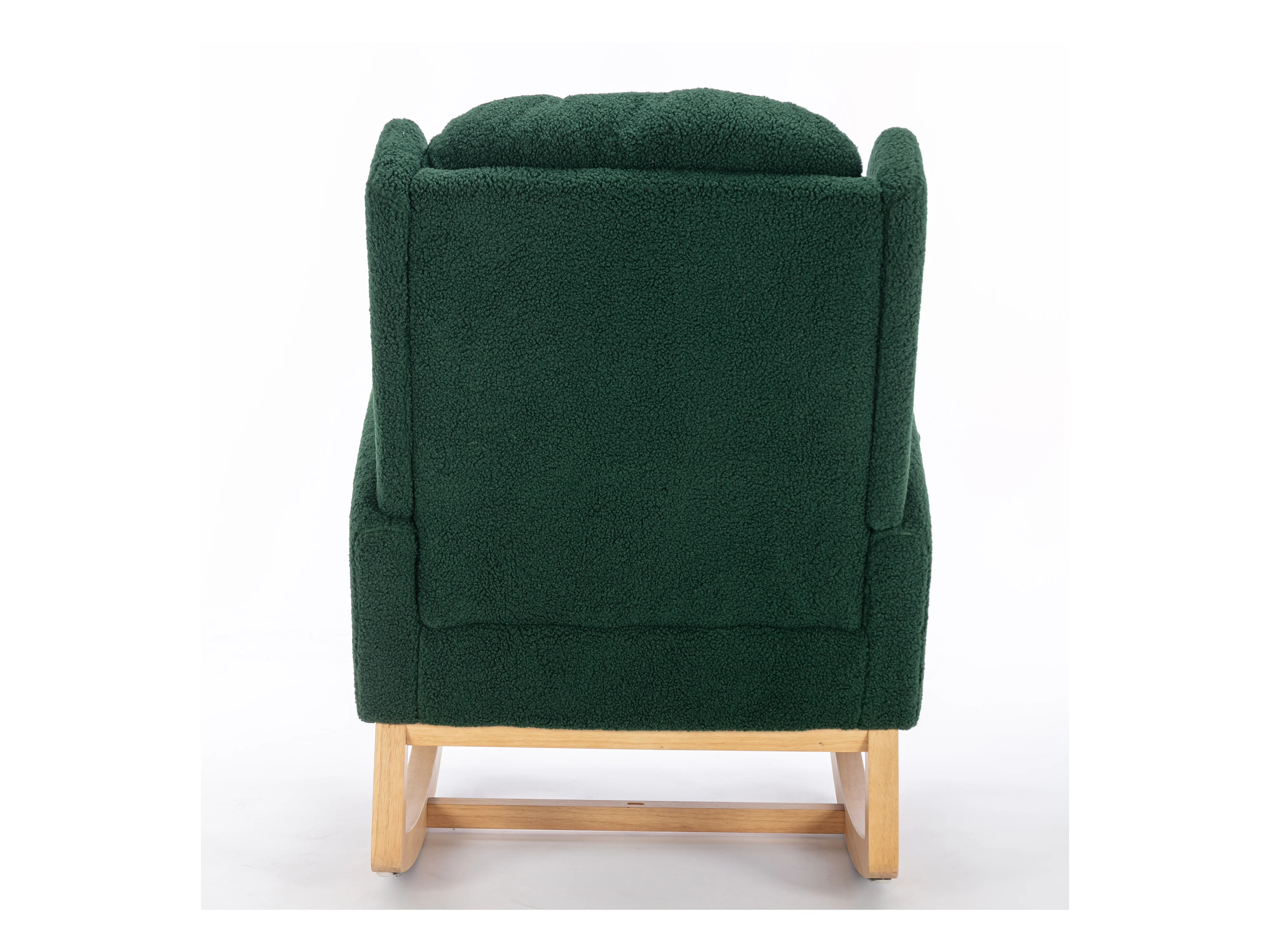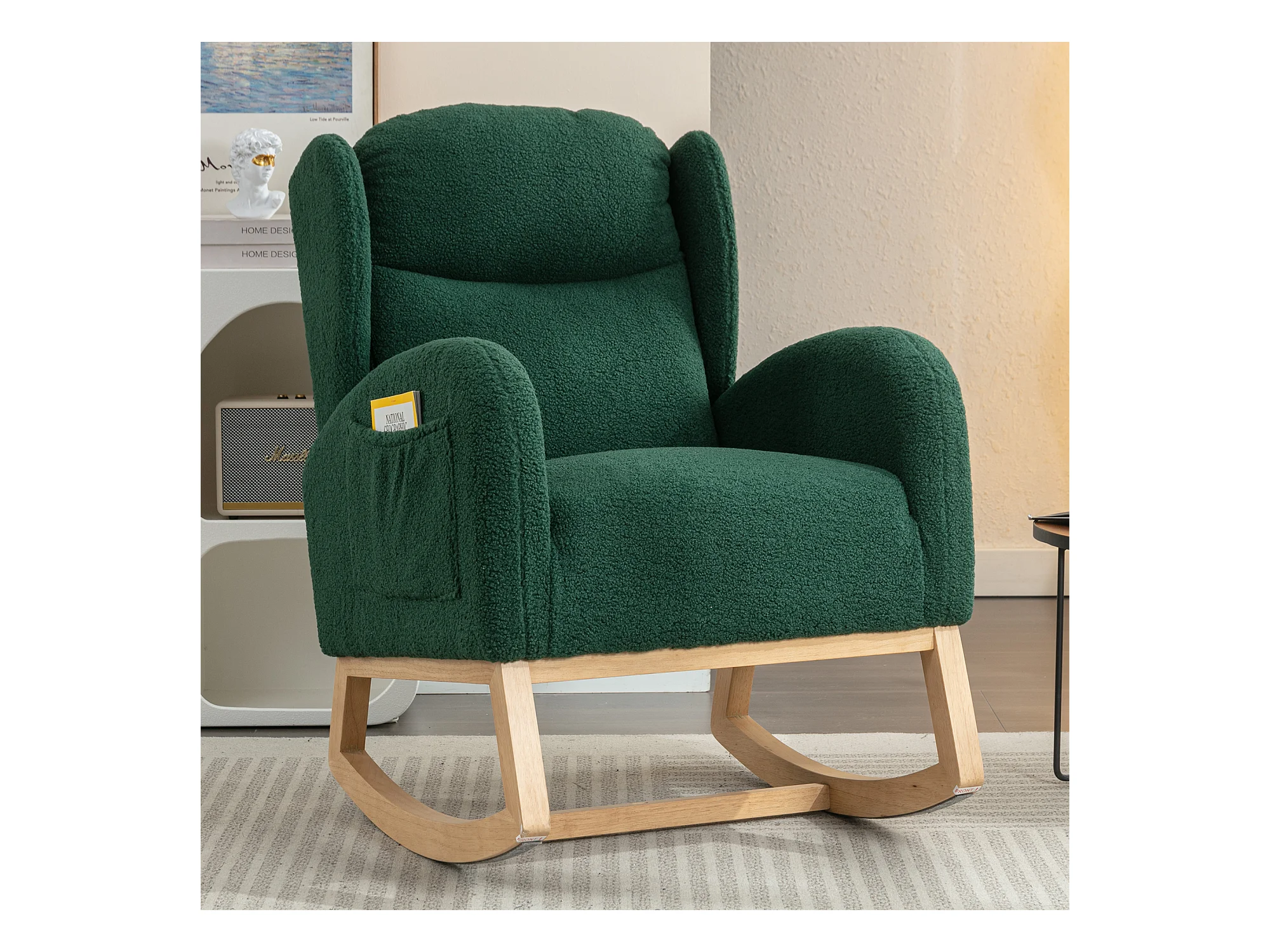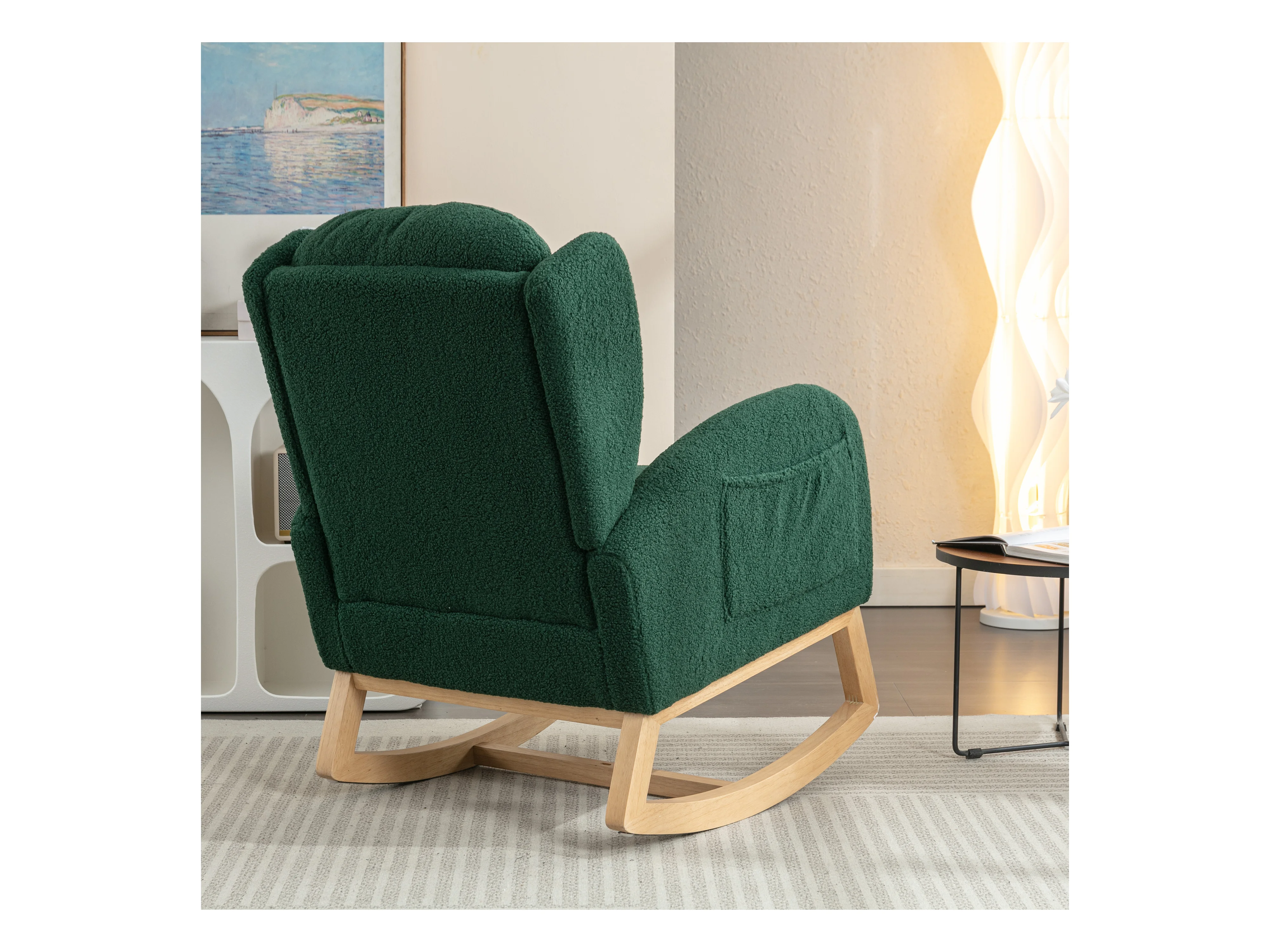 Rocking chair en tissu Teddy vert avec poches latérales, structure en bois, 96,5 x 71 x 101 cm