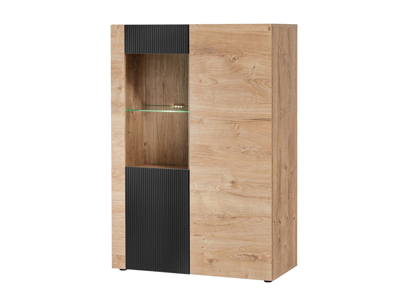 Salon complet DOUM – Buffet bas, vitrine, meuble TV avec cheminée bio-éthanol, buffet haut et étagère murale – Chêne clair et no