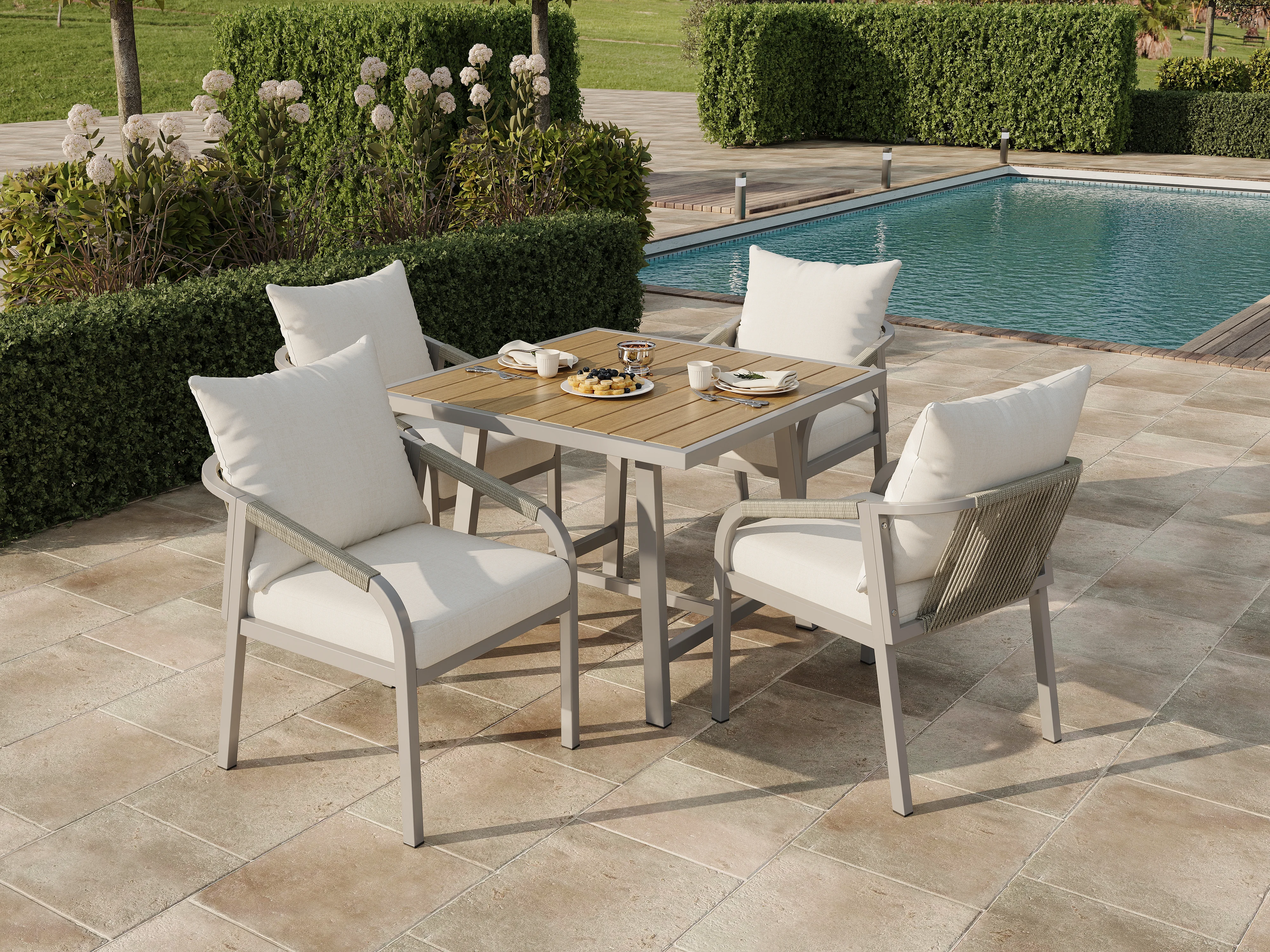 Salon de jardin 1 table + 4 chaises en acier - Plateau WPC kaki