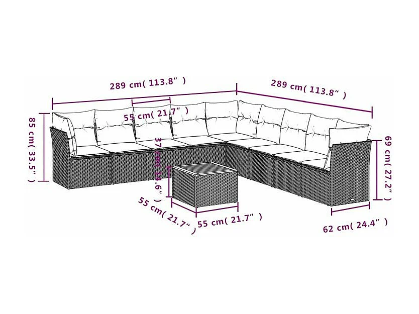 Salon de jardin 10 pcs avec coussins gris résine tressée