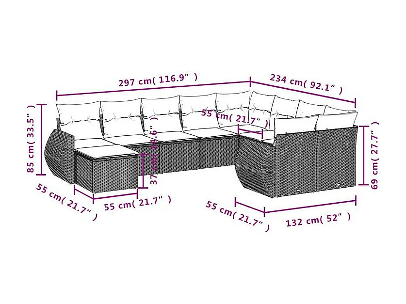 Salon de jardin 10 pcs avec coussins marron résine tressée