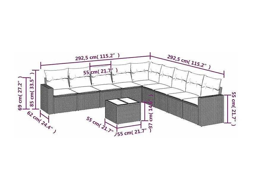 Salon de jardin 10 pcs avec coussins marron résine tressée