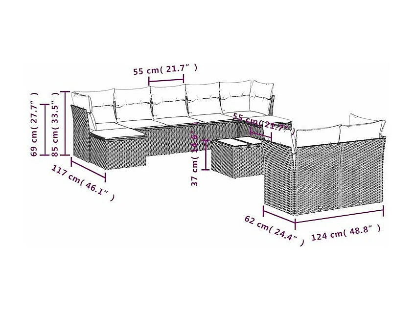 Salon de jardin 10 pcs avec coussins marron résine tressée