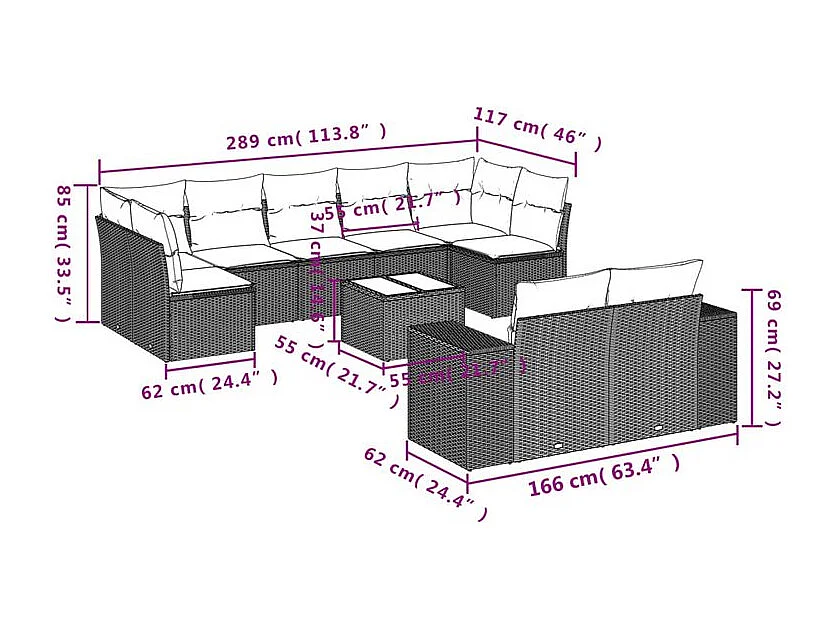 Salon de jardin 10 pcs avec coussins marron résine tressée