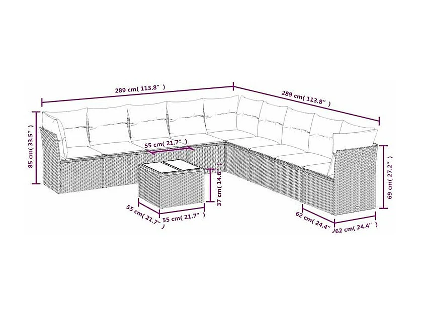 Salon de jardin 10 pcs avec coussins marron résine tressée