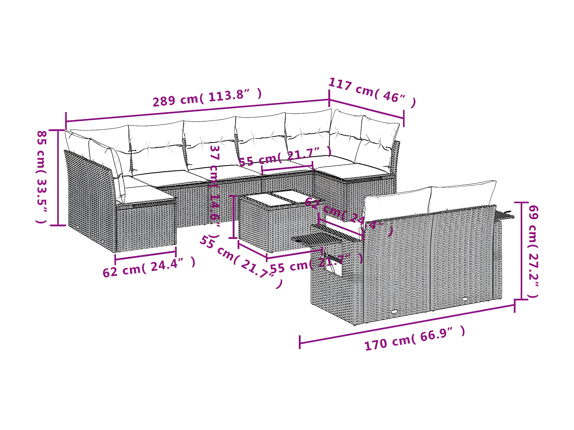 Salon de jardin 10 pcs avec coussins noir résine tressée