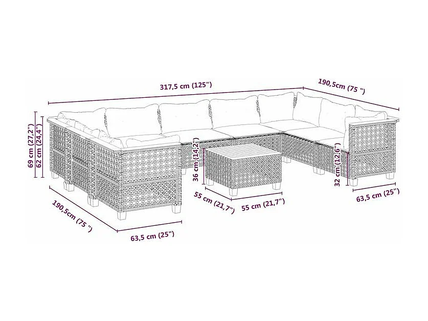 Salon de jardin 10 pcs avec coussins noir résine tressée