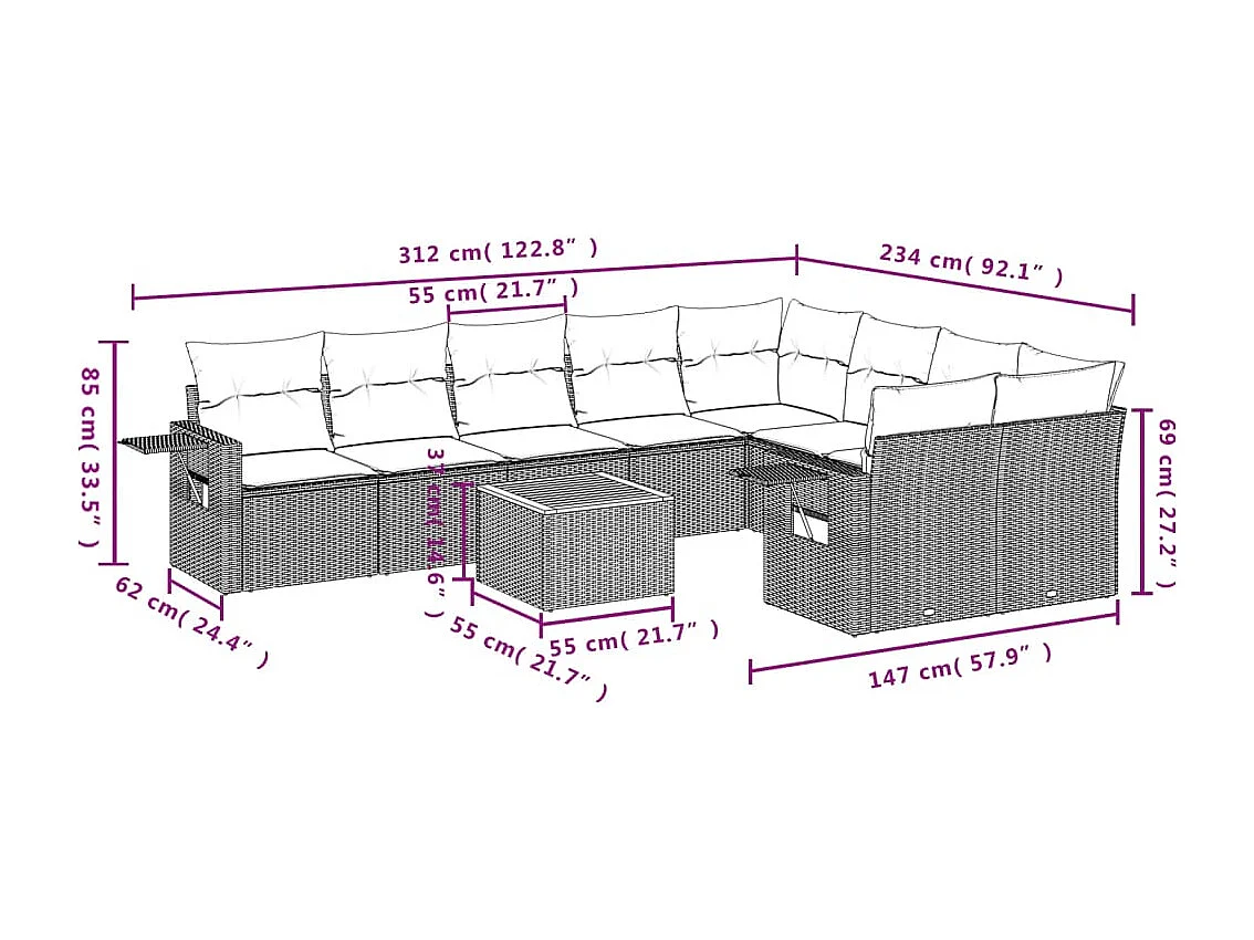 Salon de jardin 10 pcs avec coussins noir résine tressée