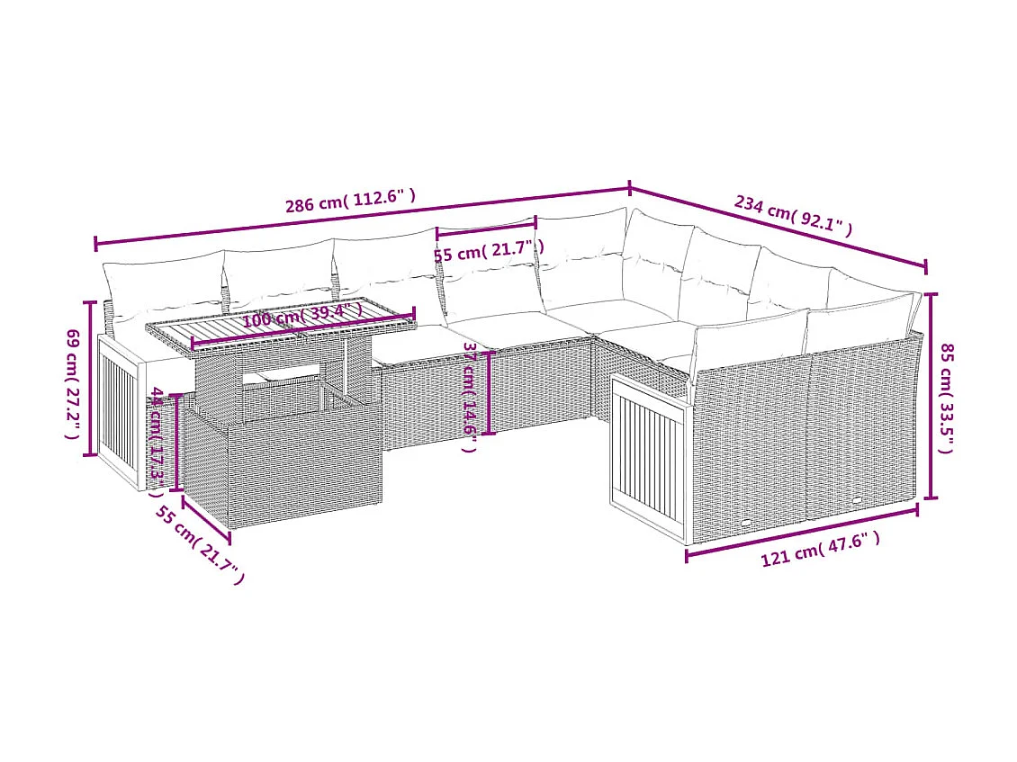 Salon de jardin 10 pcs avec coussins noir résine tressée