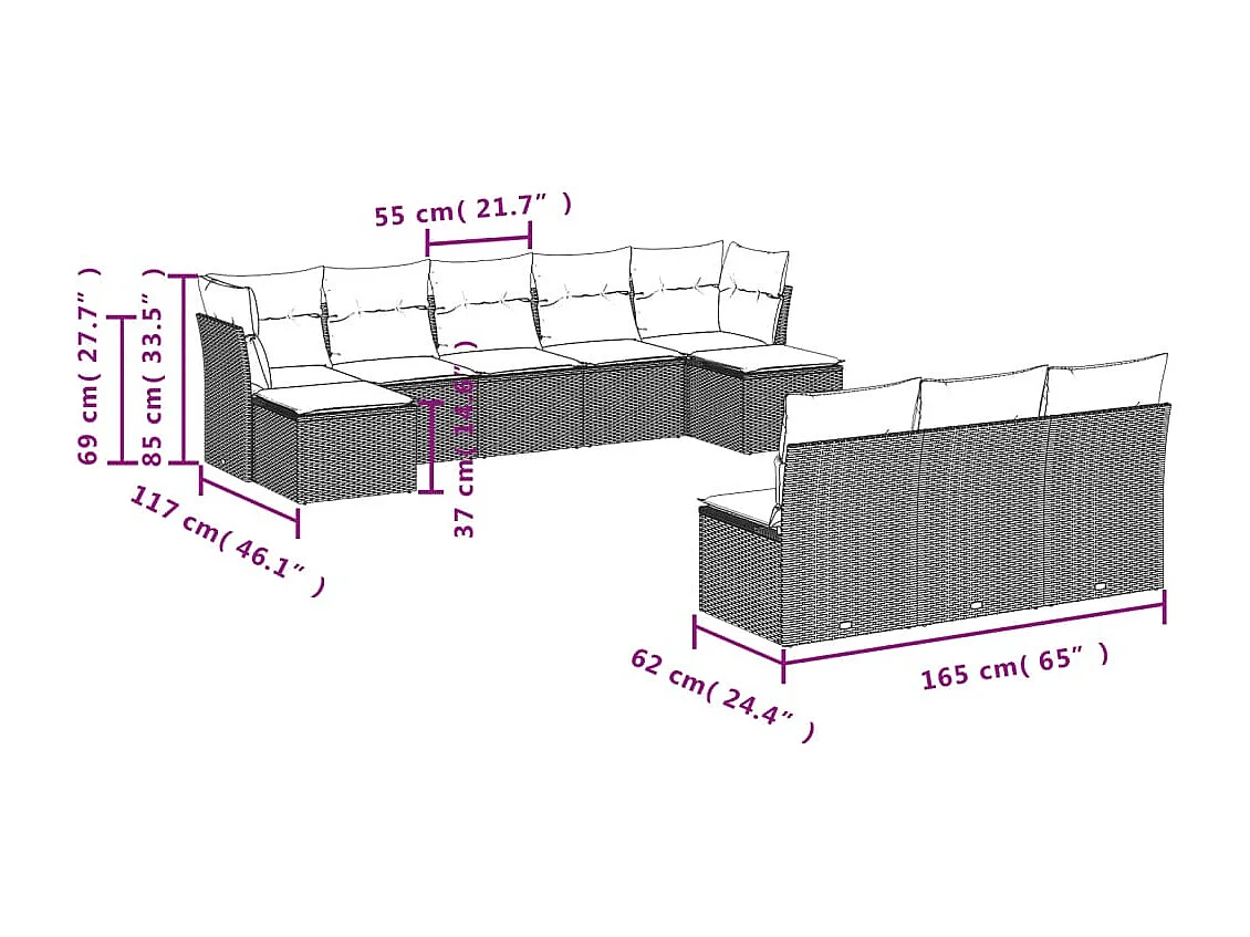 Salon de jardin 10 pcs avec coussins noir résine tressée