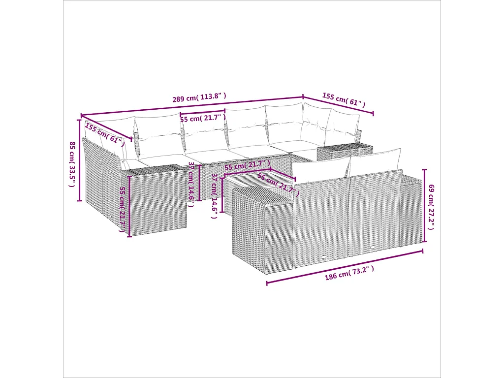 Salon de jardin 10 pcs avec coussins noir résine tressée