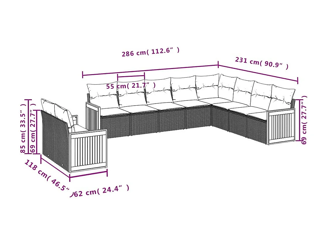 Salon de jardin 10 pcs avec coussins noir résine tressée