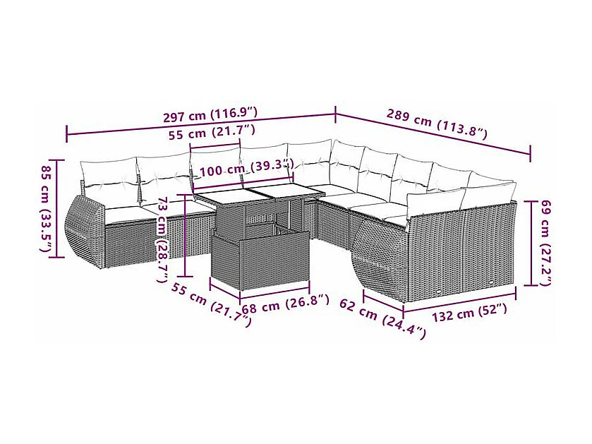 Salon de jardin 11 pcs avec coussins gris clair résine tressée