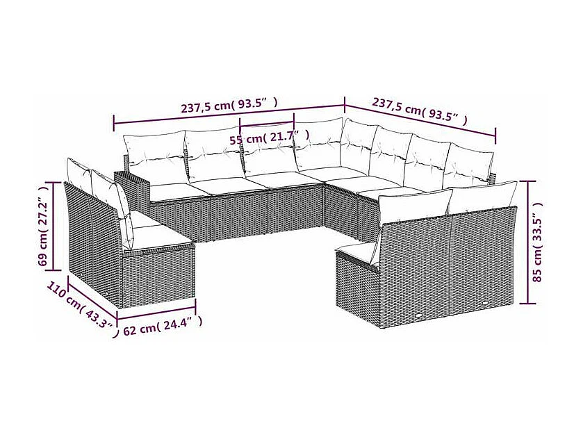 Salon de jardin 11 pcs avec coussins gris clair résine tressée