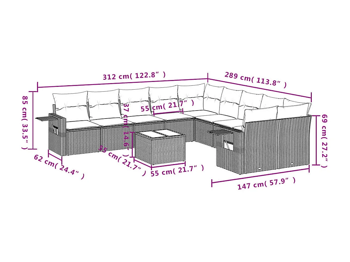 Salon de jardin 11 pcs avec coussins gris résine tressée